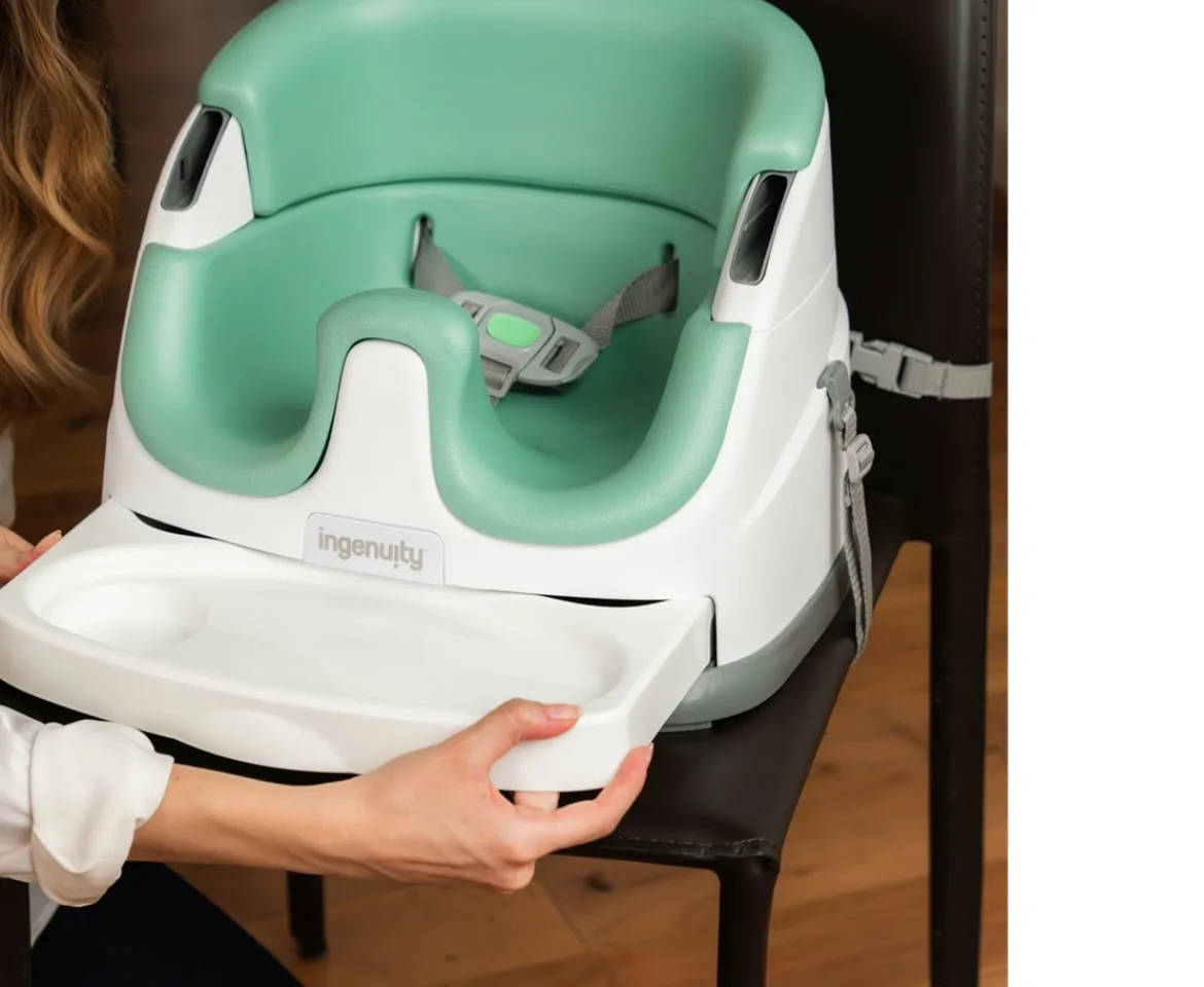 The Ingenuity Baby Base 2-in-1 Booster Seat easily attaches to dining chairs so your baby can sit up higher during family dinners, from six month, up to 15kg. Enjoy more laughter and conversation by giving your child a seat at the table with this feeding chair.Adjustable SupportThis baby booster seat offers your child a comfortable place to sit, with rubber padding for extra comfort. As your baby grows, you can remove the foam seat insert and convert the baby booster into a toddler seat. The safety harness ensures that your child is securely strapped to the chair.Compact StorageThe removable tray gives your baby their own perfectly sized table, so snacks or toys are easily within reach. When not in use, the tray conveniently tucks away right underneath the booster seat itself.Easy to CleanThis feeding chair offers wipe-down surfaces, making it comfortable for babies and convenient for parents. For all those meals in between, you can count on the wipeable seat and dishwasher-safe tray to leave you more time for family catch-up and less for kitchen clean-up.2 Different UsesThis portable baby feeding seat is ideal for when baby wants to sit with you at the table. It also works as a floor seat during playtime!
