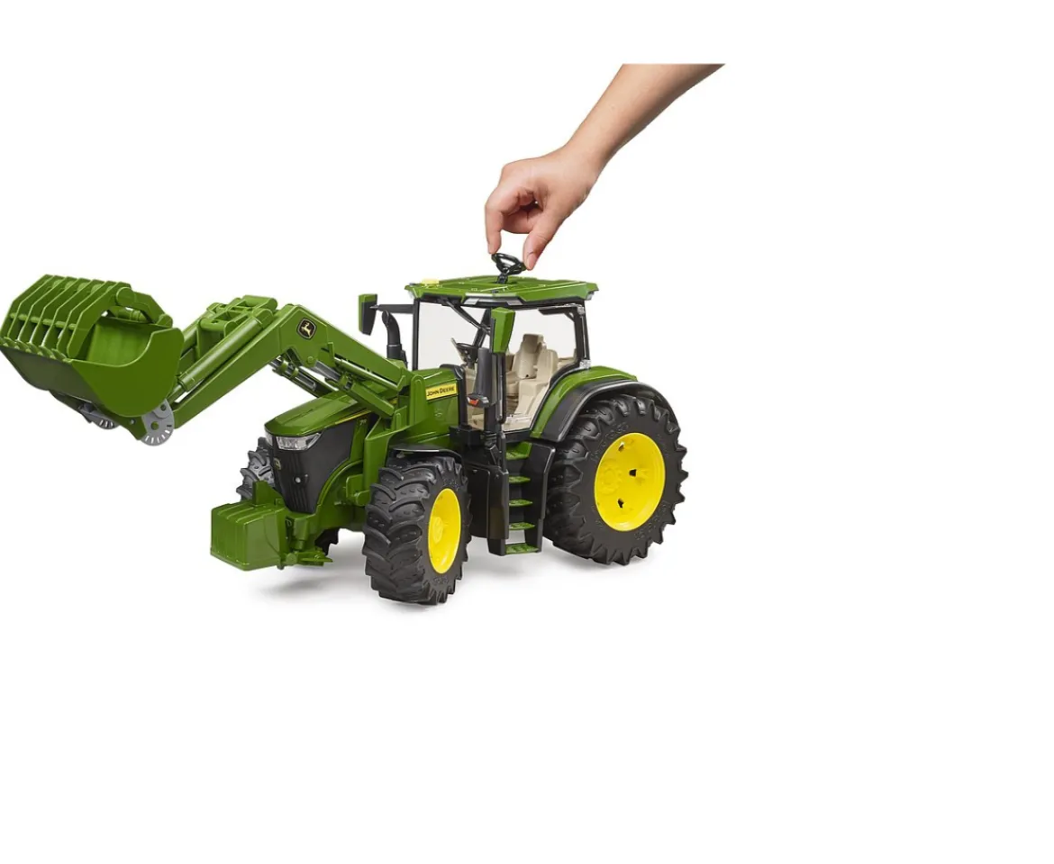 Modern agriculture is no longer conceivable without modern tractors. As farmers’ work is not only complex, but also full of challenges, they need the right technology. John Deere 7R series tractors combine a low total weight with high performance. This agile tractor not only speeds up transports, but also drives any operation forward.This important tractor is new at BRUDER, where it can be found in the agriculture theme world. True to the Bruder motto “Just like the real thing”, the tractor is equipped with many realistic details. The bonnet opens and shows the impressive engine. Doors can be opened and offer the optionally available bworld figures space in a modern cabin. Typical of BRUDER is the excellent controllability and ride comfort due to the installed oscillating axle as well as the steering extension that can be inserted through the sliding roof. The height-adjustable rear coupling is compatible with all Professional series trailers which can also be loaded by the slip-on front loader. All trailers from the BRUDER agricultural range can be mounted on this tractor.               Â