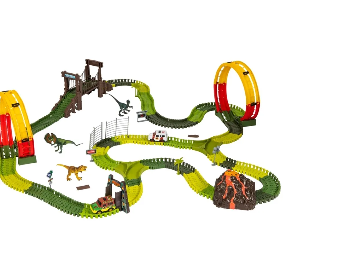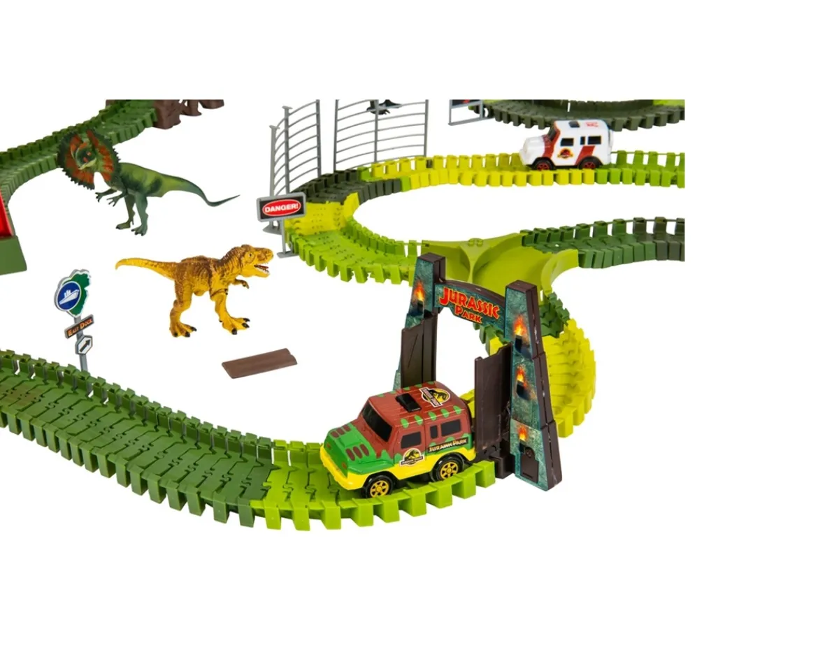 Let the thrilling fast-paced amazing adventures begin with this awesome Jurassic Park Track Playset. Imagine Jurassic World adventures when you build and display your very own dino-themed racing track.Jurassic Park Racing TrackWith this buildable racing track, you can create your own thrilling action-packed scenarios. The dino-themed toy comes with 405 pieces that connect together, so you can build the racing setup of your dreams. Build your track, place your cars on it, and get ready to roar into action!So Many OptionsThe Jurassic Park Track Playset features several exciting options for you to play out new dinosaur-themed adventures. Set up the bridge, or speed through the steaming volcano and light-up gate. With these dinosaur racing tracks, there are so many ways to play.Build and Build AgainThese dino-themed toys are easily rebuilt for the next dinosaur action. For even more action- packed imaginative play, transport the two fearsome creatures all around the track. You and your friends can also track and capture these dinos for exciting Jurassic World adventures!