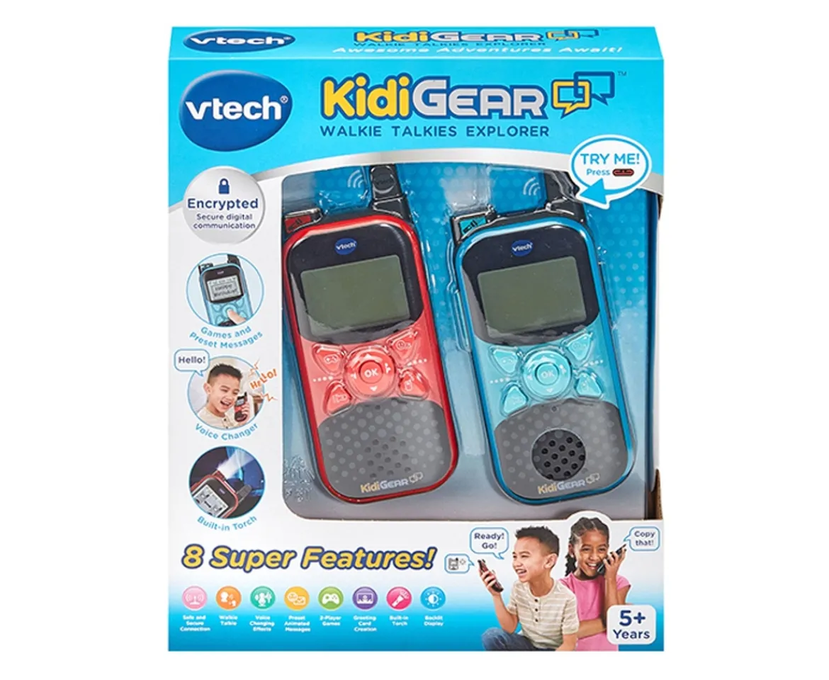 Chat; send messages and play games with the VTech® KidiGear™ Walkie Talkies Explorer! The cool new design and built in torch helps you light the way while going on your very own adventures. Keep in touch indoors and out, at home or on the go! These child-safe two-way walkie talkies feature a digital connection that keeps your child`s conversations secure, preventing other walkie-talkie users from hearing. Have lots of fun trying the different built-in voice effects! Little adventurers can also send messages back and forth by choosing from the fun built-in animations. Walkie talkies also include four cool two-player games for real-time gaming between devices which test your memory skills and enhances play!