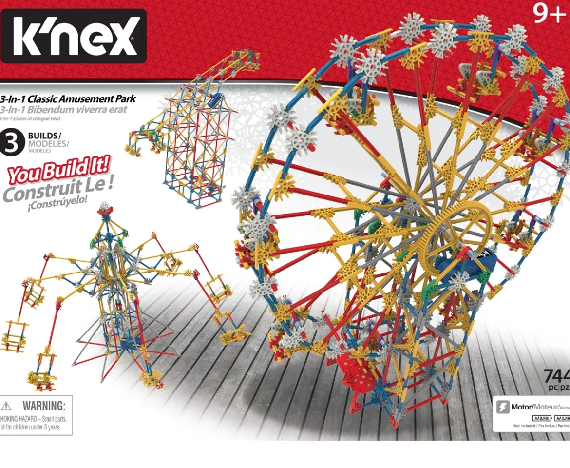 - It’s time to open a fairground with this K'NEX Thrill Rides 3-in-1 Classic Amusement Park Building Set. With 3 separate and exciting fairground rides to build at different times, this is the perfect kit for kids that require a slightly more challenging independent play session. The set offers 744 fun-coloured rods and connectors to fit together, as well as a motor for fully-independent rotation of the rides. This kids building toy provides highly durable snap-fit pieces that can also be assembled in limitless other combinations after the rides are complete and the parts also fit together easily with other K’NEX pieces. Helping to develop your child’s hand-eye coordination, spatial awareness, problem-solving skills, this construction set for children is ideal for boys and girls aged 9+