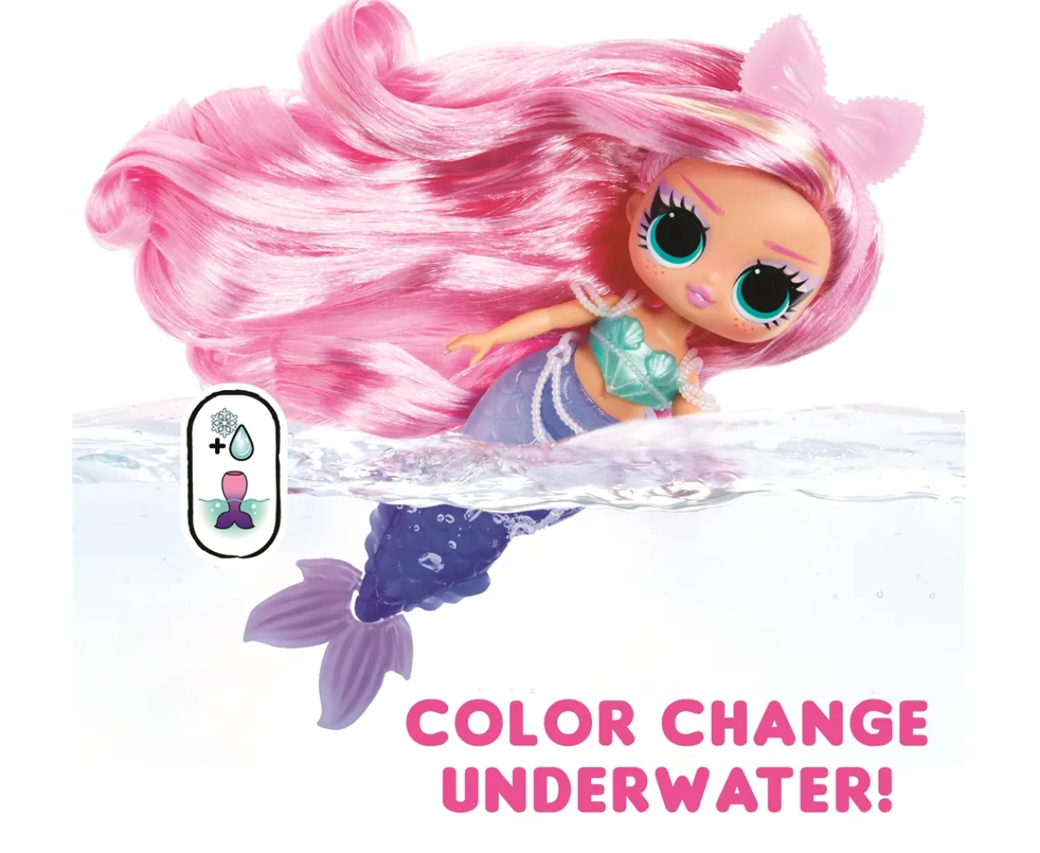 I’m in Be Tween, with underwater style and colourful surprises like you’ve never seen! Look out world, cuz we mermaids are going to make a splash! Get ready to dive into an enchanting world of magical mermaid fun with the all-new L.O.L. Surprise Tweens Mermaid Lola Waves fashion doll with dazzling accessories to unbox! Perfect for bath time and imaginative play, Lola Waves brings a splash of excitement with her beautiful colour-changing tail and mesmerizing fin that can move back and forth! Dip your Tweens Mermaid doll into cold water and watch as her tail transforms colours from light cobalt blue to deep lavender blue, creating a magical underwater experience! Can you guess what her pearl white fin changes colours to? Don’t forget to style your doll with her charming accessories including her sea shades, adorable bow headband, and cute pearl belt with hearts! She has stunning features, gorgeous hair, her own fashionable mermaid look, and comes articulated for tons of posing opportunities, including sitting as she bends at her waist! She can even stand on her fin, making styling your doll even easier with greater stability! Discover what’s inside each box including a fabulous L.O.L. Surprise Tweens Mermaid doll, glasses, a headband, and a belt to complement the doll’s tail! Collect all 4 glamorous L.O.L. Surprise Tweens Mermaid fashion dolls: Cleo Clove, Lola Waves, Lana Marine, and Serena Finn for a complete set of endless mermaid fun!