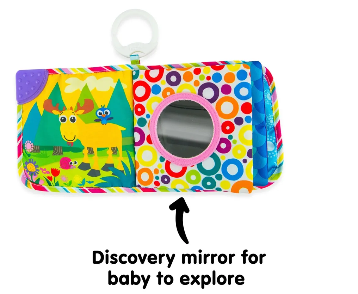Discover the sights and sounds of The Lamaze Friends Soft Book. Interactive soft pages feature a discovery mirror, textured chewy corner, surprise crinkles and bright colors for baby to explore. The Lamaze clip lets you hook your book to strollers, carriers and diaper bags to take along for on-the-go fun.
