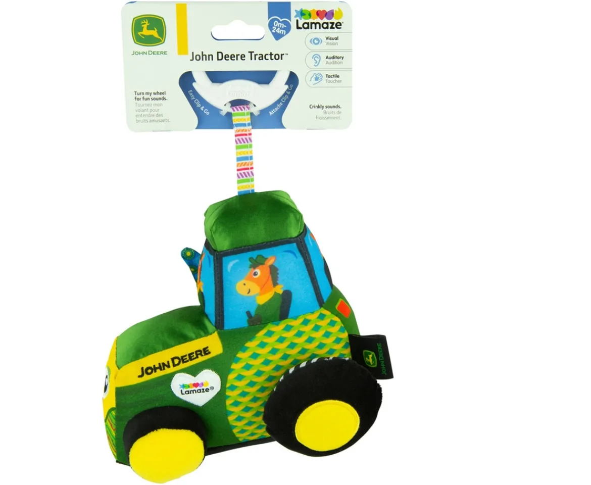 The Lamaze John Deere Tractor Clip & Go toy is full of developmental features to engage your baby. Turning the wheel creates intriguing clicking sounds to encourage auditory development. Interesting textures and crinkling sounds make grabbing and squeezing this toy tractor even more fun! High contrast patterns and bright colours provide baby with visual stimulation during play time. The Lamaze on-the-go clip lets you hook this cute baby toy to strollers, carriers and diaper bags for fun where ever you go.