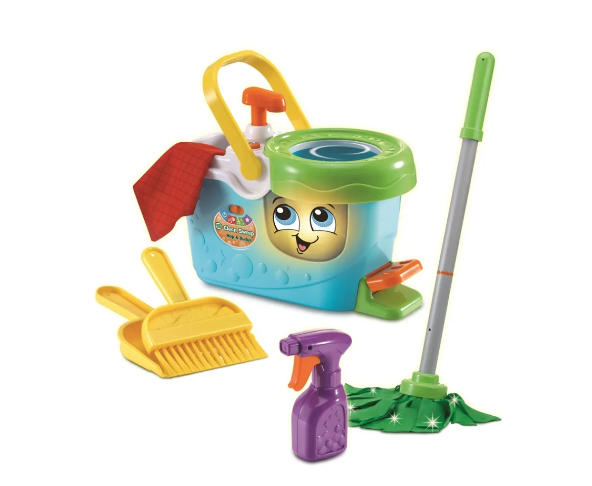 - • Play clean up with the spray bottle, cleaning cloth, interactive bucket, mop, dustpan and broom