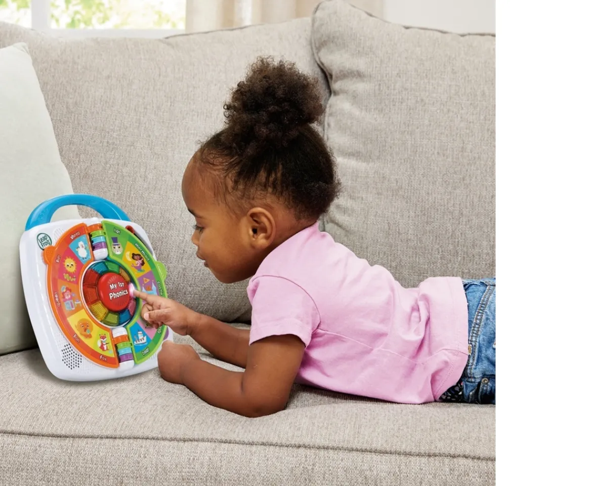 Children will delight in learning 44 phonemes in the English language with the LeapFrog My 1st Phonics: Spin & Learn. 5 double-sided flip pages feature colourful images and over 100 words chosen specifically to help toddlers have fun learning language sounds!Kids can press the 10 light-up buttons to explore each picture, learning the word and highlighted letter sound, or they can press the big red button in the middle to see the lights swirl around for random learning.Four learning modes let toddlers explore the 44 sounds of English, practise with fun phrases, and hear sounds blend into words. In ‘Fun Sounds’ mode, they get to match delightful sound effects with pictures.