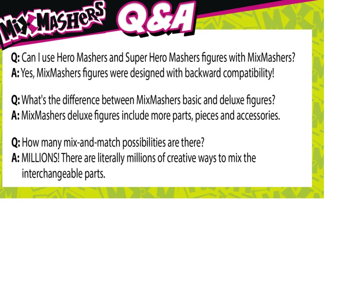 - MixMashers figures feature durable universal connectors for repeated mixing and mashing