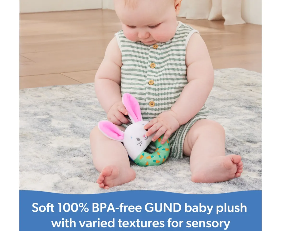 Inspired by the popular “Hop Little Bunnies” song, this soft rattle stimulates baby’s senses with textures, sounds, and colors.