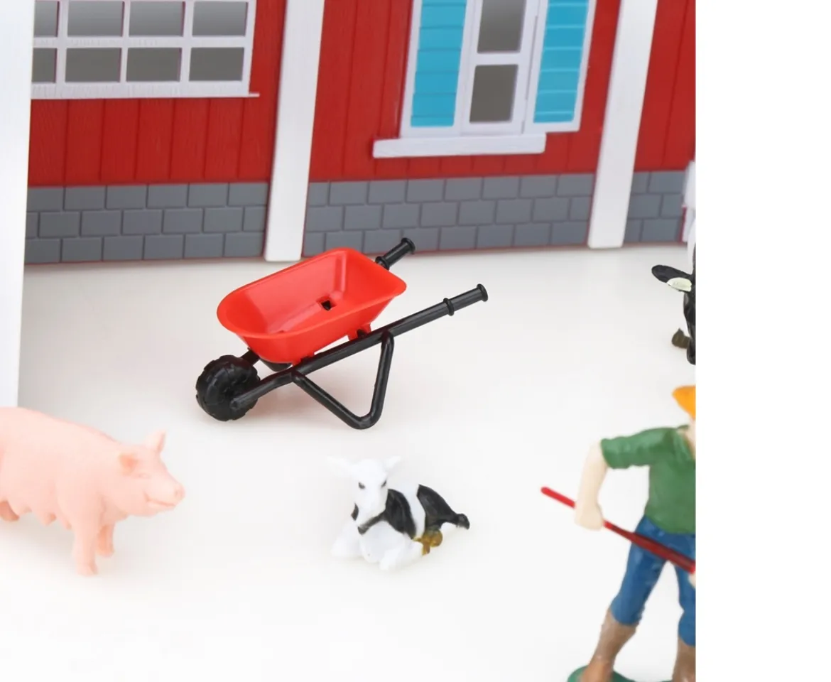 - Contents: 1x Red Barn House; 1x New Holland Farm Tractor Toy; 1x Grain Feeder; 1x Grain Accessory; 1x Farmer Figure; 1x Wheel Barrow; 1x Cow Family (4x Cow Figures); 1x Piggy