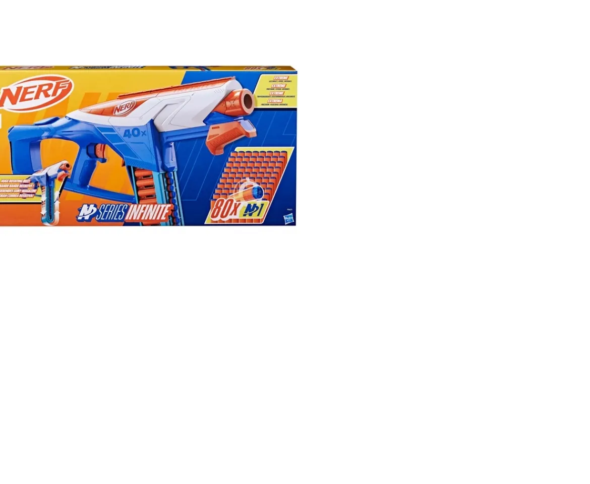 The NERF N Series Infinite dart blaster features an innovative battle belt that lets you reload darts quickly and easily as you play! No more stopping the game to reload. And the removable belt has a big 40-dart capacity to swamp the field with darts. The pump-action Infinite blaster includes 80 NERF N1 foam darts and has onboard 16-dart storage. To play, load darts into the belt, pump the priming slide back and forth, and pull the trigger to fire a dart.The NERF brand levels up your game with high-performance NERF N Series dart blasters and NERF N1 darts! You have the skills as a NERF battler, now you have the blaster and darts to gain a superior edge in indoor and outdoor play. Please note that NERF N Series blasters are compatible only with NERF N Series N1 darts.
