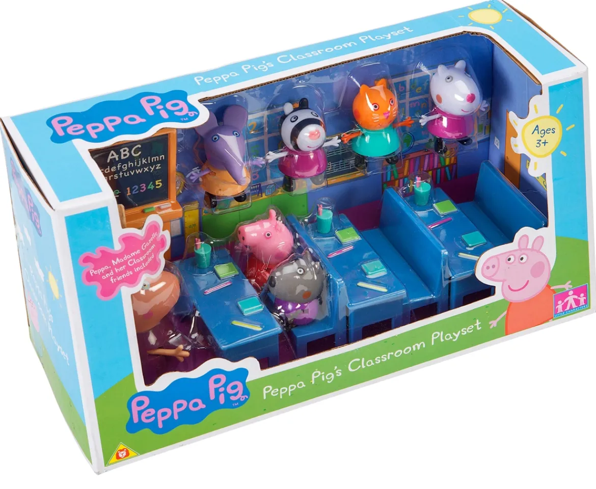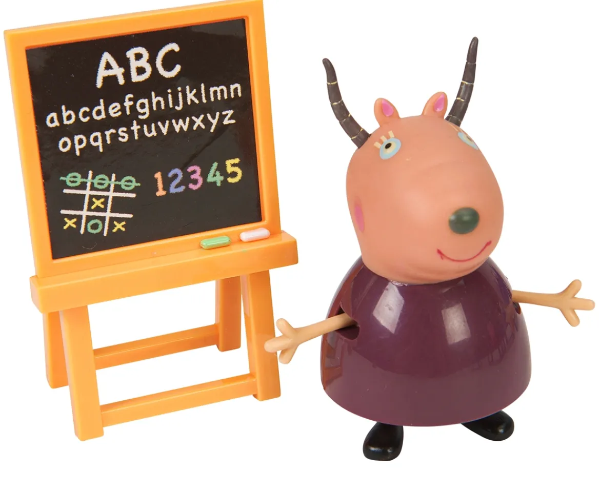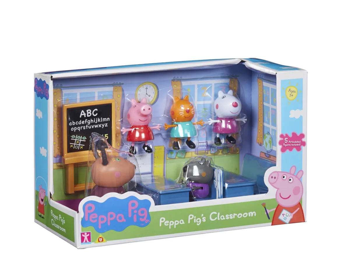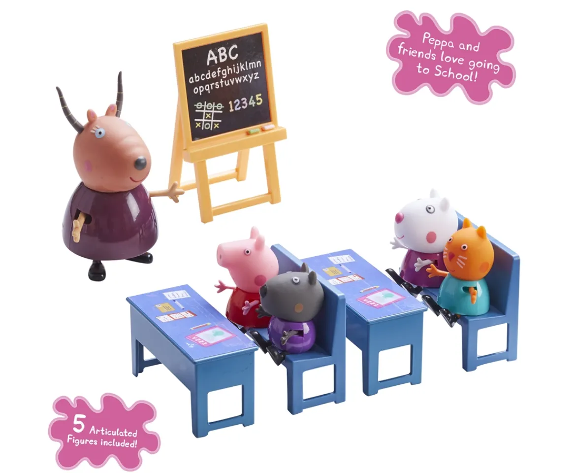 Learn your ABC’s with Madame Gazelle in the classroom with Peppa Pig and her friends. This playset includes: Chalkboard, 2 tables, 2 benches, Madame Gazelle, Peppa Pig, Suzy Sheep, Danny Dog & Candy Cat articulated figures. For ages 3 years and over.