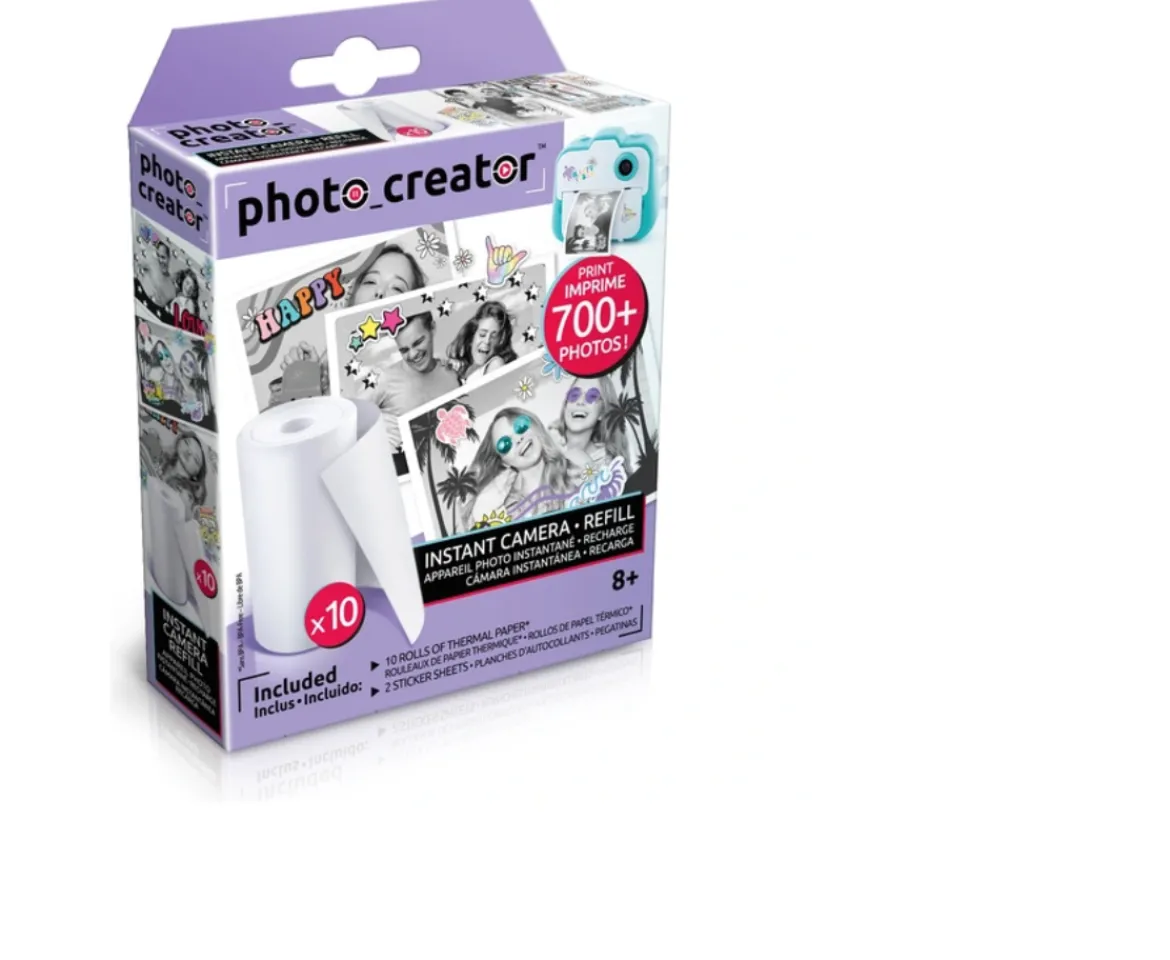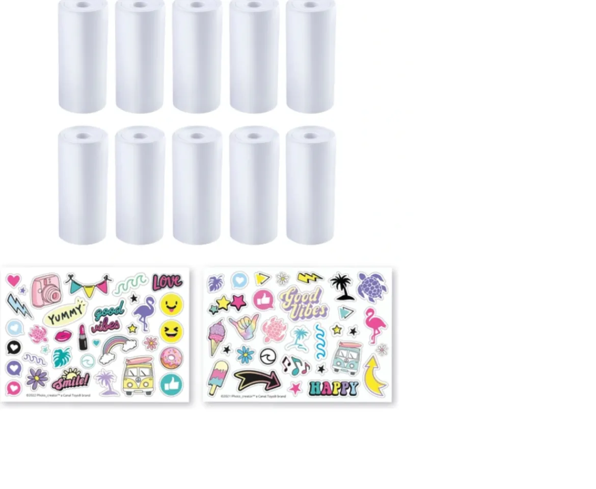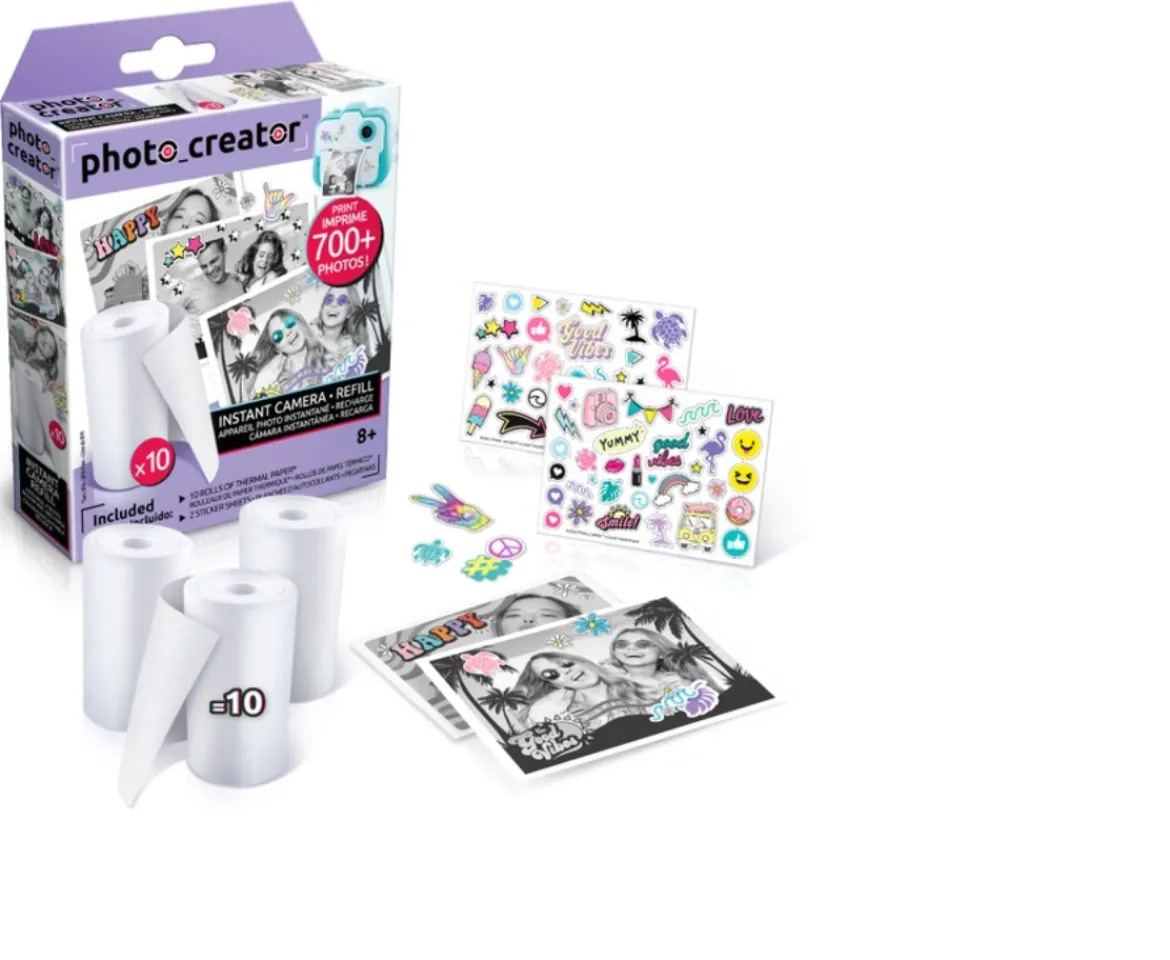 This Photo Creator Refill Paper Rolls comes with 10 paper rolls and 2 sticker sheets for use with Photo Creator Instant Camera #208949 (Each sold separately) With 10 paper rolls you can print over 600 more photos! Plus find 2 special sticker sheets so you can get creative and personalise your prints!The amazing Photo Creator instant print camera uses thermal technology to print onto the paper so no ink is needed & prints are instantly dry! (Each sold separately)