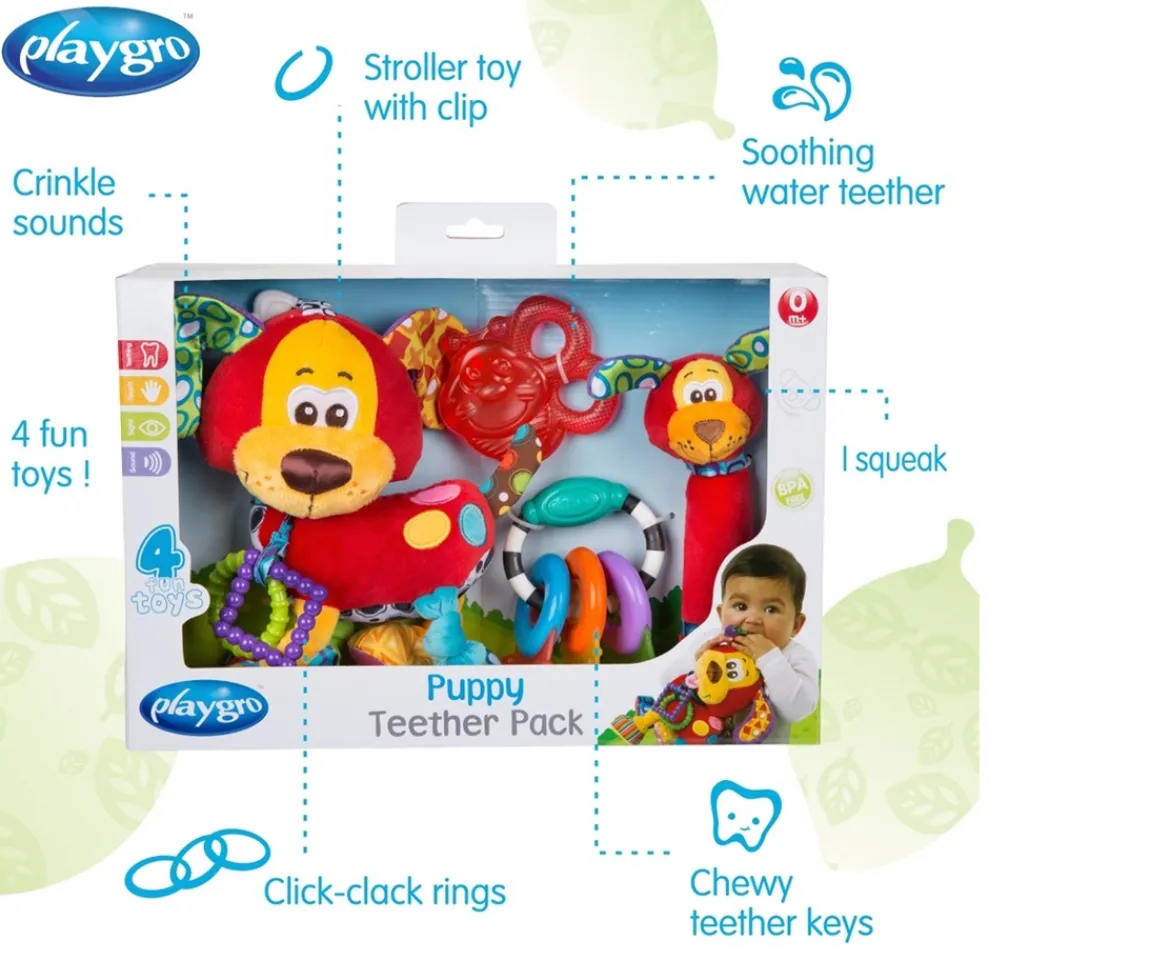 The Playgro Puppy Teether Pack has everything a teething baby needs to sooth sore gums. This newborn gift set features four engaging toys that support baby’s teething, fine motor skills, gross motor skills, sensory development and imagination.Stroller ToyThe Playgro Puppy Teether stroller toy clips to baby’s stroller for sensory fun wherever you go. The large clip attaches easily to most prams, pushchairs and cots. This baby toy features textured tags for tactile development, bright colours, click-clack rings and crinkle sounds.Soothing TeethersThis baby gift pack comes with 2 teething toys designed to soothe sore gums. The Water Bee teether can be chilled in the fridge for a cooling effect, while the Teether Keys are chewy and textured to soothe sensitive gums.SqueakerThis Playgro Puppy Teether Pack for babies also includes an easy-grasp Puppy Squeaker to stimulate baby’s hearing and encourage fine motor skills.