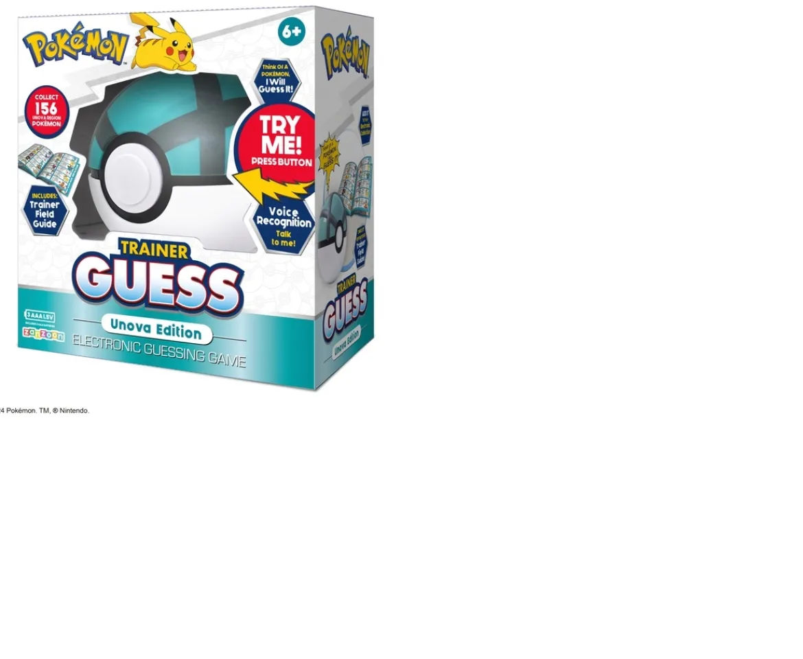 Test your Pokémon knowledge with the Pokémon Trainer Guess: Unova Edition! Guess and collect 156 iconic Pokémon from the Unova region, all stored in your Net Poké Ball.Simply think of a Pokémon and answer the questions. Trainer Guess will figure out what Pokémon you are thinking of – amazing! From Legendary and Mythical Pokémon to First Partners and their evolutions, this game includes all the favourites! Your Pokémon are automatically added to your electronic collection to track your progress.The clever Poké Ball uses speech recognition technology, so there is no need for buttons or reading. Take it with you anywhere, whether indoors or out. A Field Guide is included for players to discover all the Pokémon, complete with names, pictures and details.