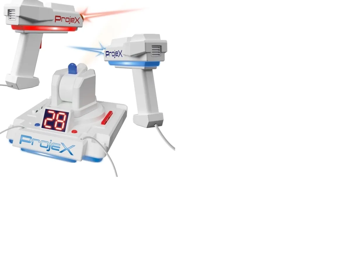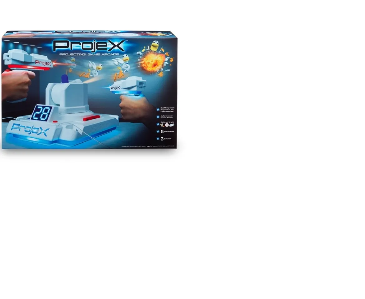- When it’s lights off, it’s game on with ProjeX™ Projecting Game Arcade. No TV necessary. Just point ProjeX at a blank wall, grab the blaster, aim and blast the targets!