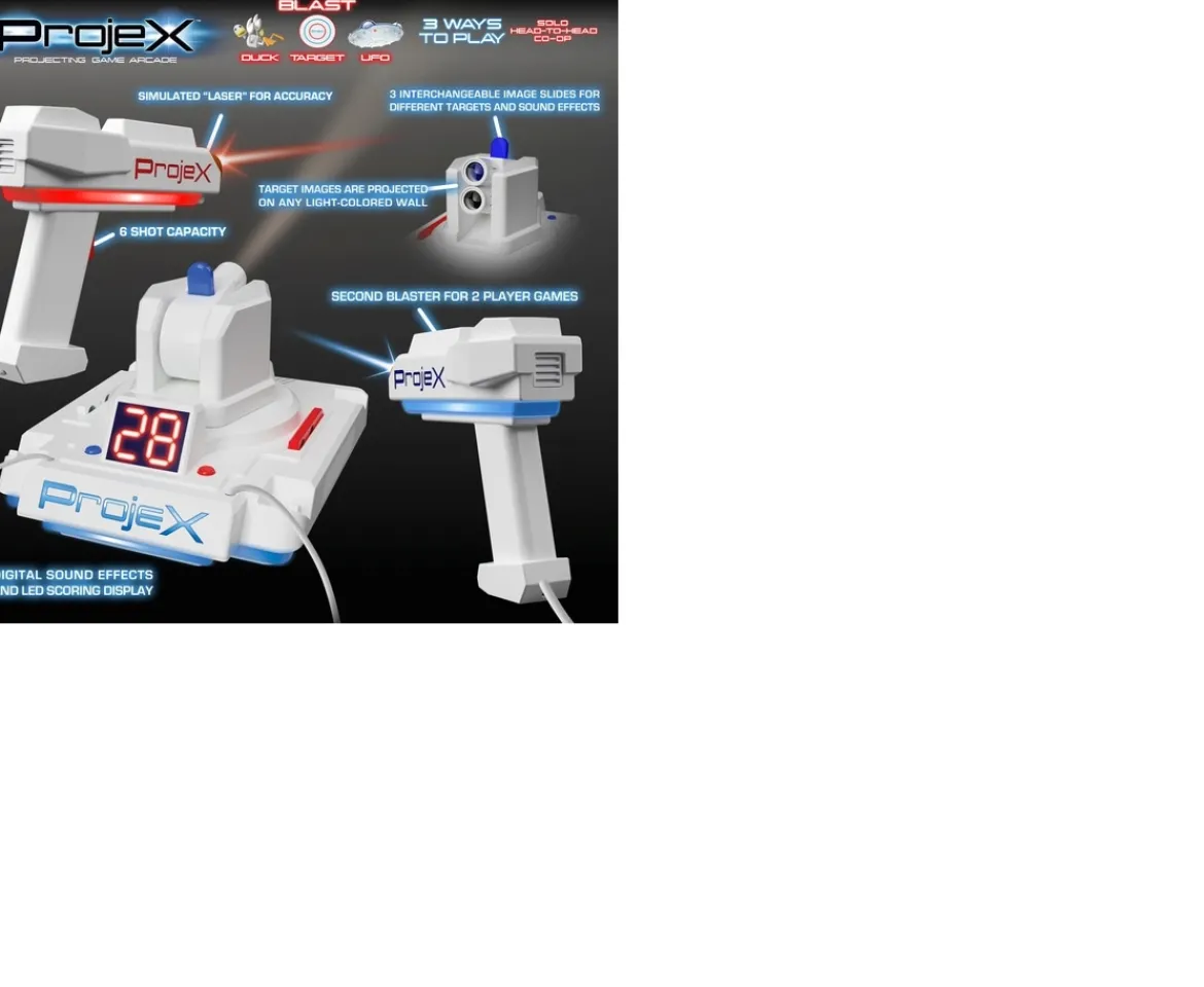 - ProjeX lets you test your speed and skill as you blast the moving targets that it projects right onto your wall! Three interchangeable image slides let you project ducks, targets or UFOs – each with its own unique sound effects!