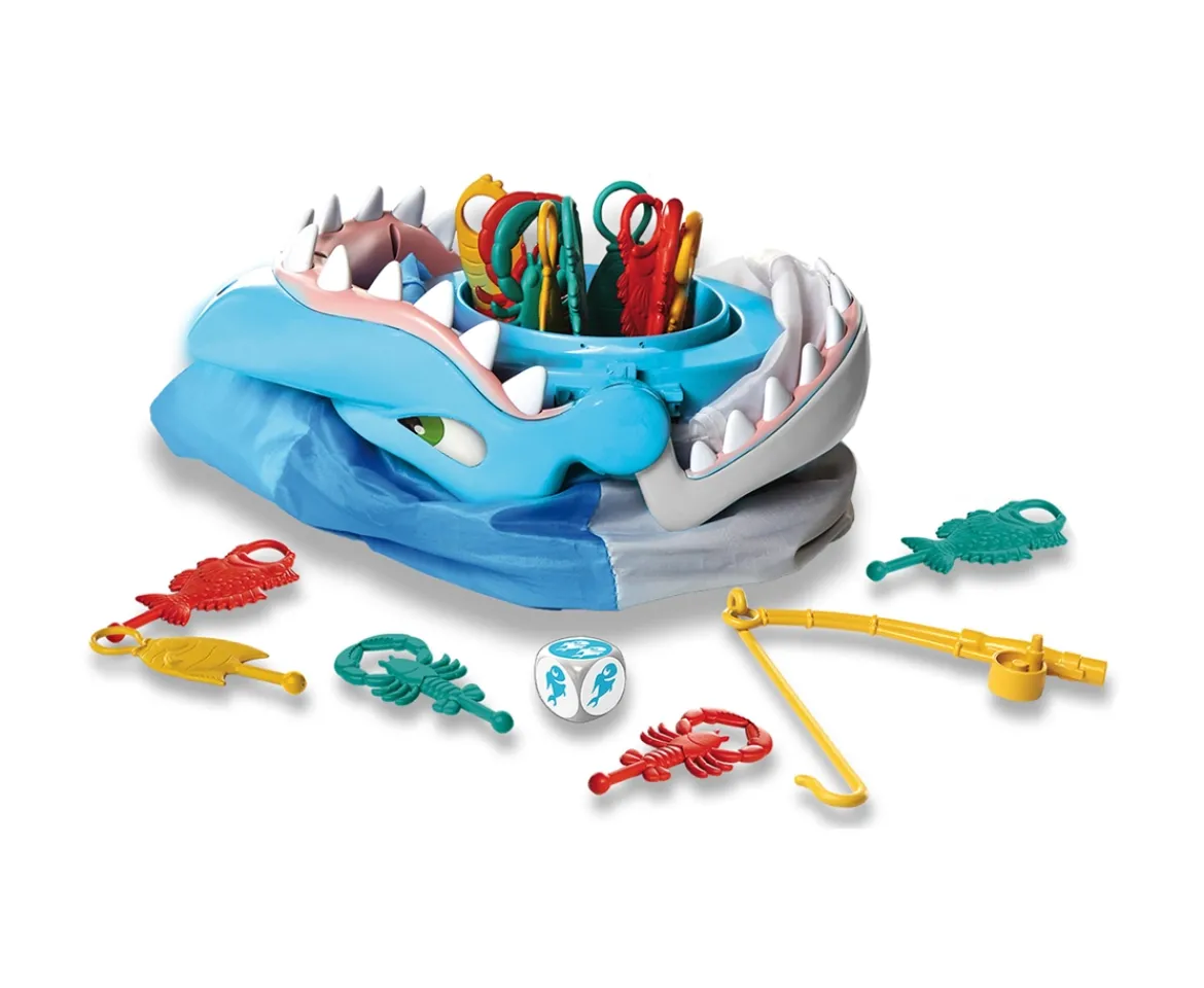 Save you catch before he snaps! Rescue the fish from the shark’s mouth using the fishing rod, but be careful he might bite! Roll the dice to see how many fish you need to rescue from the shark’s jaws. The player with the most fish at the end of the game is the winner!