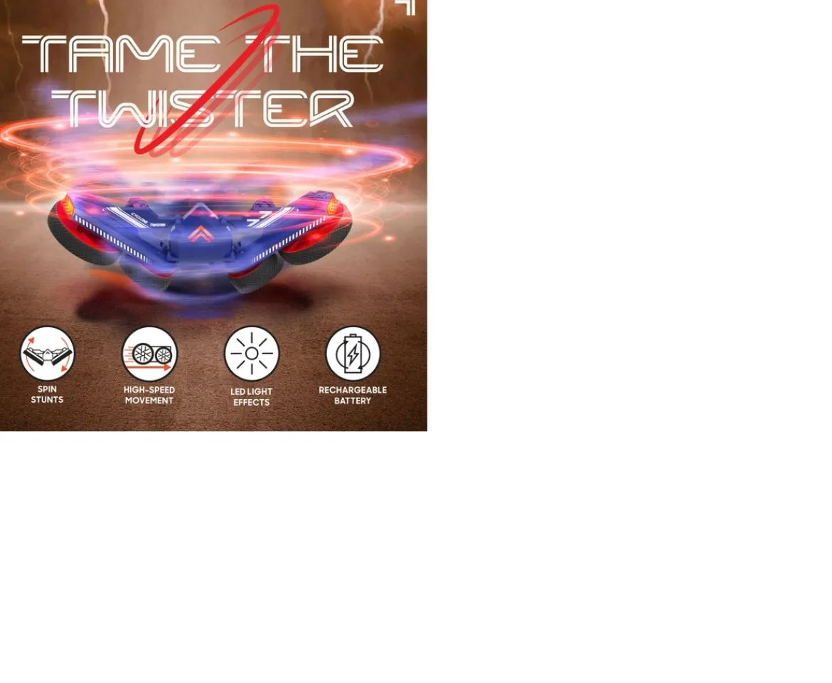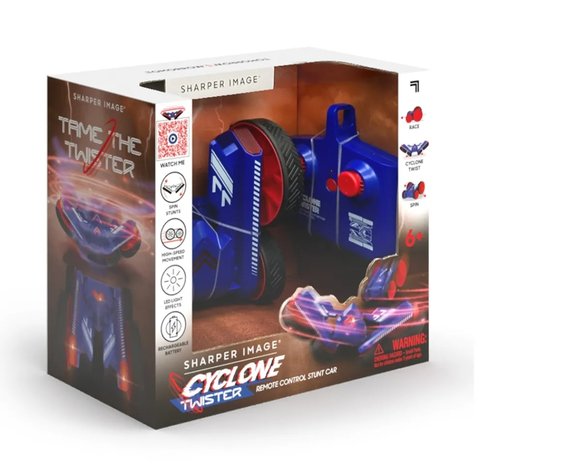 The incredible Sharper Image Cyclone Twister Radio Control Stunt Car looks like a futuristic robotic tank, and transforms into a wild Cyclone machine, with big, bright LEDs that create a spectacular light show for non-stop action and amazing stunts!The Cyclone Twister drives fast, performing awesome tricks like flips and spins — it can even drive upside-down! With vibrant LED lights, this RC stunt car lights up the night like a spinning cyclone.