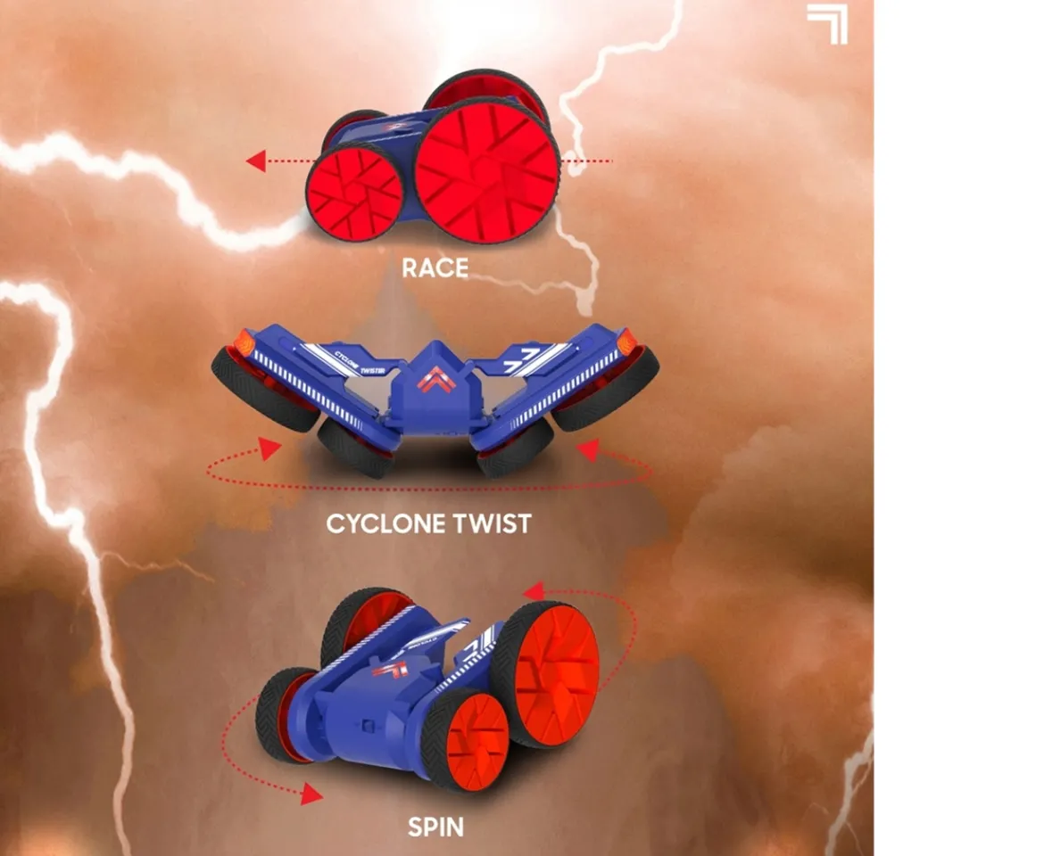 - Contents: Cyclone Twister RC Stunt Car; 1x Remote Control; 1x USB Charge Cable