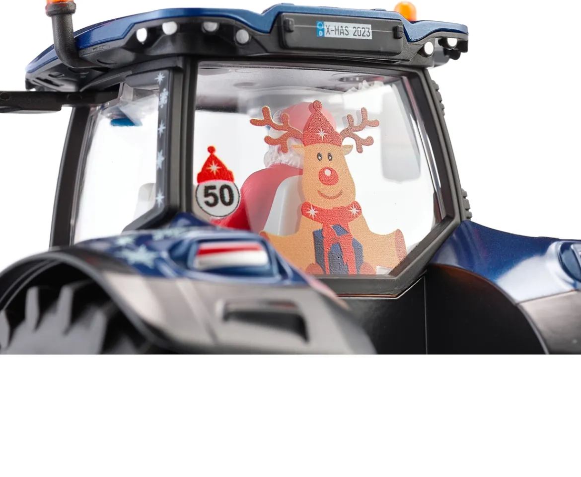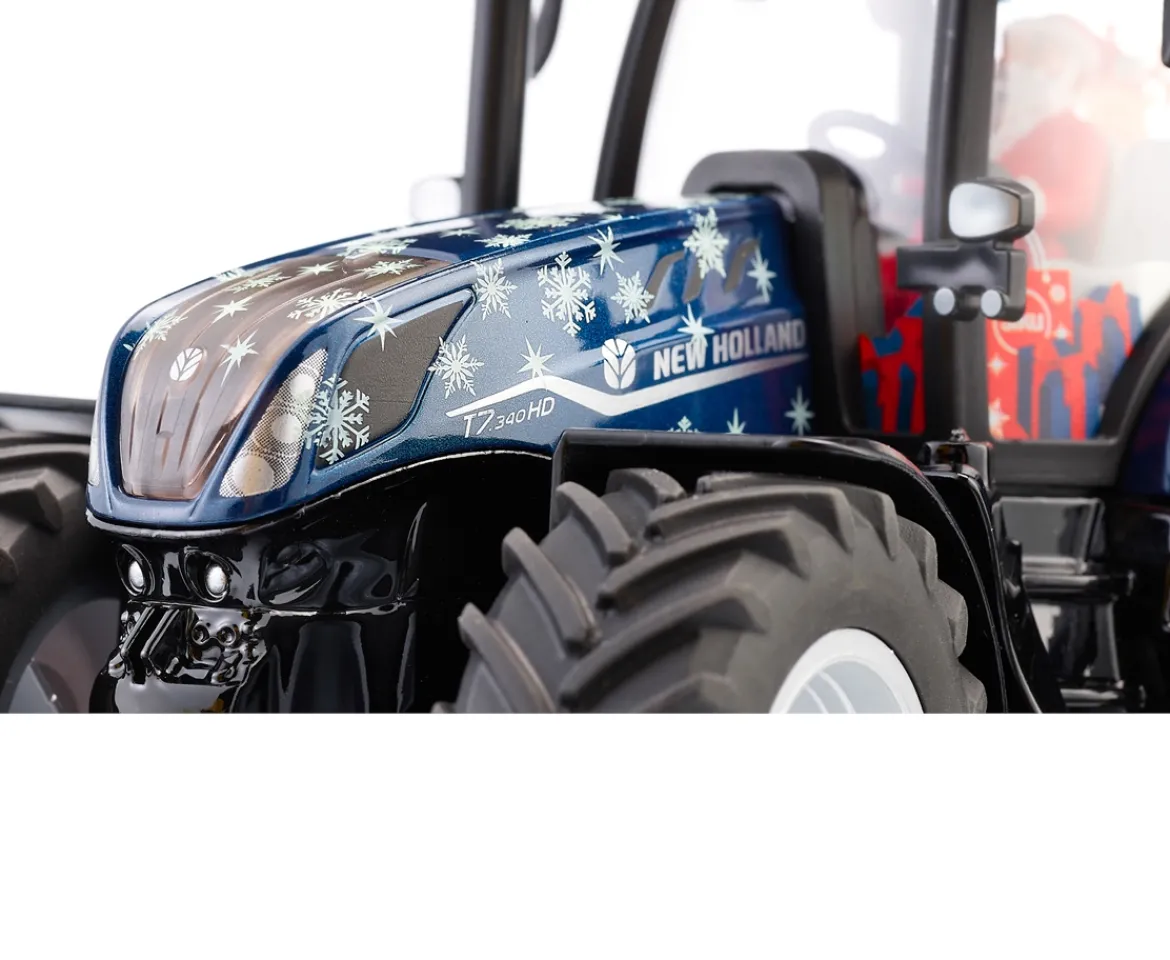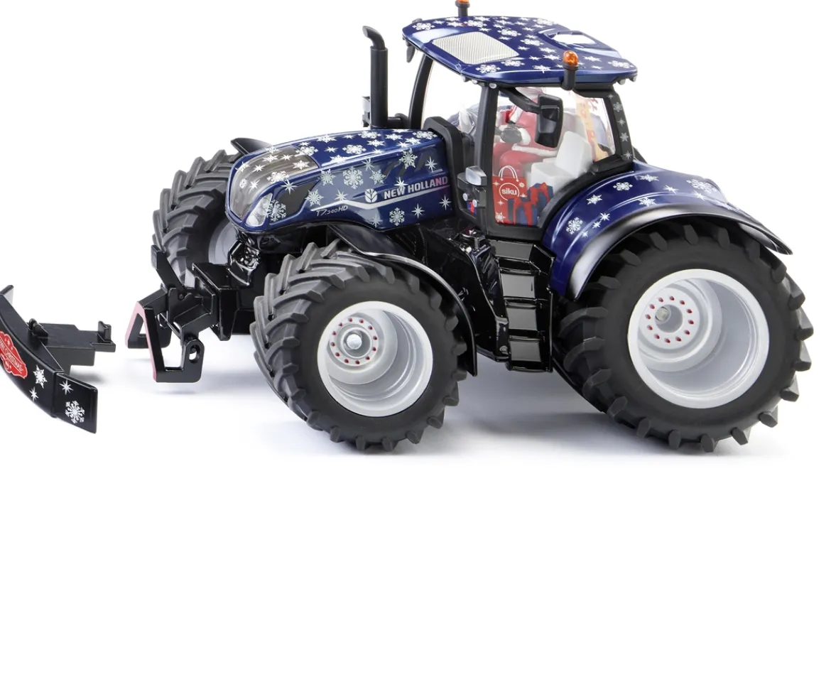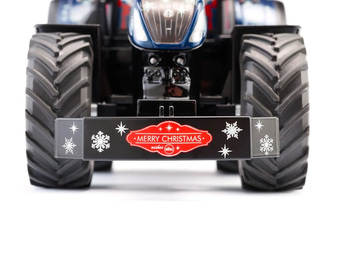 Santa has decided to switch from his sleigh to the very special Siku’s limited Christmas edition, dark blue metallic New Holland T7 to make better progress in the snow!This Christmas version of the New Holland T7.315 HD features an impressive amount of detail. The driver is none other than Santa himself. The vehicle has also been printed with an ice crystal design and a wide variety of Christmas motifs adorn the driver’s cab. In addition, the tractor has Ackermann steering, an opening bonnet, siku standard couplings at the rear as well as at the front, folding mirrors and a removable cab. A front weight with “Merry Christmas” printing is included as an accessory, which can be exchanged with the front coupling by a simple mechanism.
