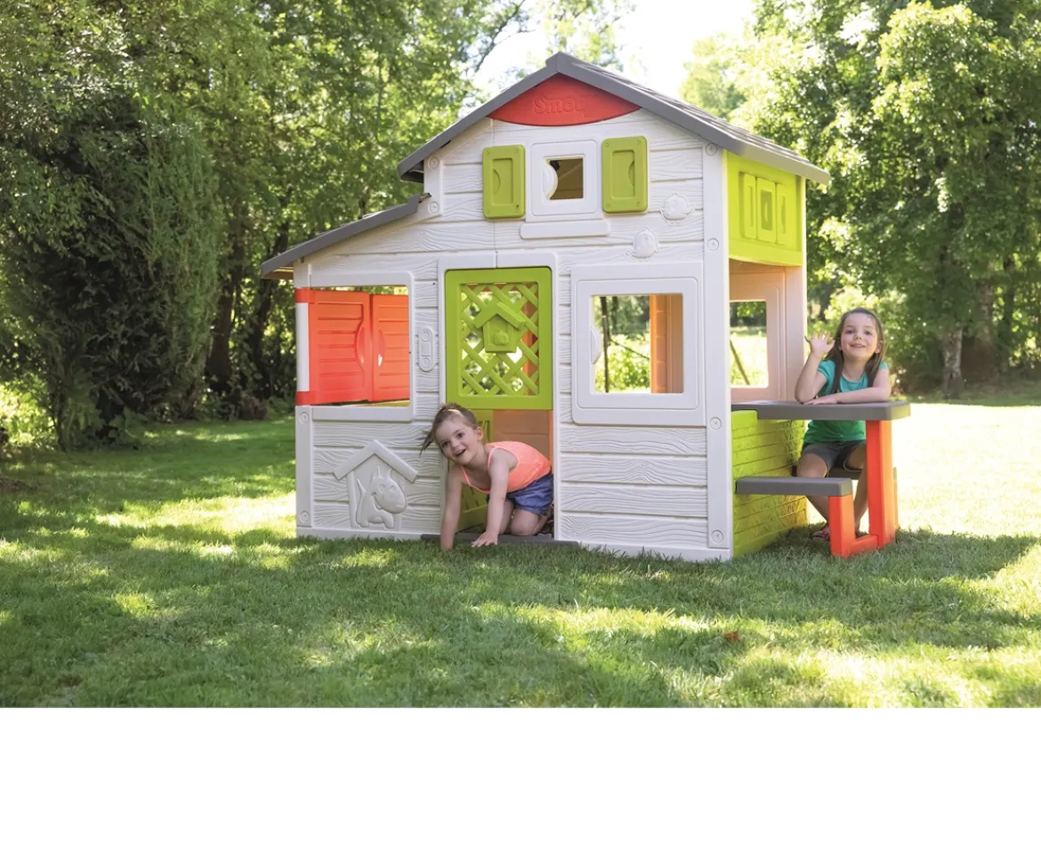 The extra-large Neo Friends playhouse for kids has a modern design and combines several play options under one roof. The summer kitchen attached to the outside wall has a sink with a tap (not functional), a barbecue grill plate and a dish rack.The Perfect Playhouse for KidsThe lovingly designed exterior facade is a real eye-catcher with its wood and stone look. Thanks to the high play roof, the Neo Friends house for kids is also perfect for older children. The picnic table with the two benches is easy to assemble and can be placed outside or inside the house. The window sashes can be rotated 360° and there’s even a real electronic doorbell!Plastic Kids’ PlayhouseThe individual plastic parts of the playhouse are easy to assemble thanks to the well-thought-out plug-in connections with the supplied plastic screws. The connections on this playhouse for kids can be released too for easy disassembly. The playhouse is made of high- quality, UV-stable plastic and is particularly resistant to weather and colour fading.