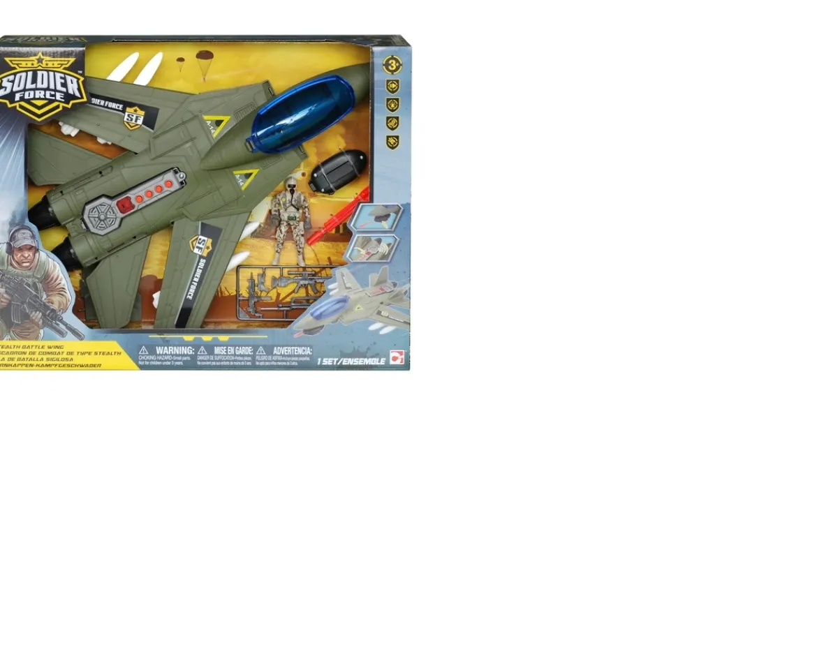 It’s time to take on a secret mission in the Stealth Battle Wing! Fit the fully posable action figure inside the cockpit of this jet fighter and pretend to fly him high above his foes encampment to infiltrate the enemy territory.Time to unleash the jet’s full firepower. Press the button for battle lights and sounds. Uh-oh, he’s been spotted! It’s also decked out with mini missile launchers – just press the button to mount your defense.