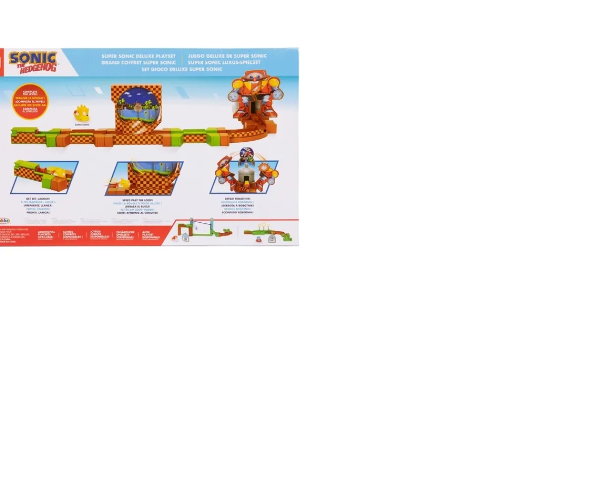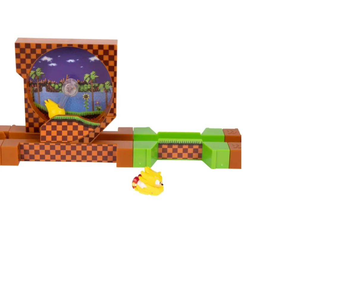 Zoom into the world of Sonic with the Super Sonic Deluxe Playset! Launch Super Sonic and watch him speed through the Green Hill Zone loop, defeat Dr. Eggman, and save the day at the finish line! Fast racing fun as you complete the Zone!Combine the Sonic Adventure Playset and Knuckles Adventure Playset for endless racing adventures (each sold separately). Let gravity power your Sonic journey! Includes a diecast Super Sonic figure.