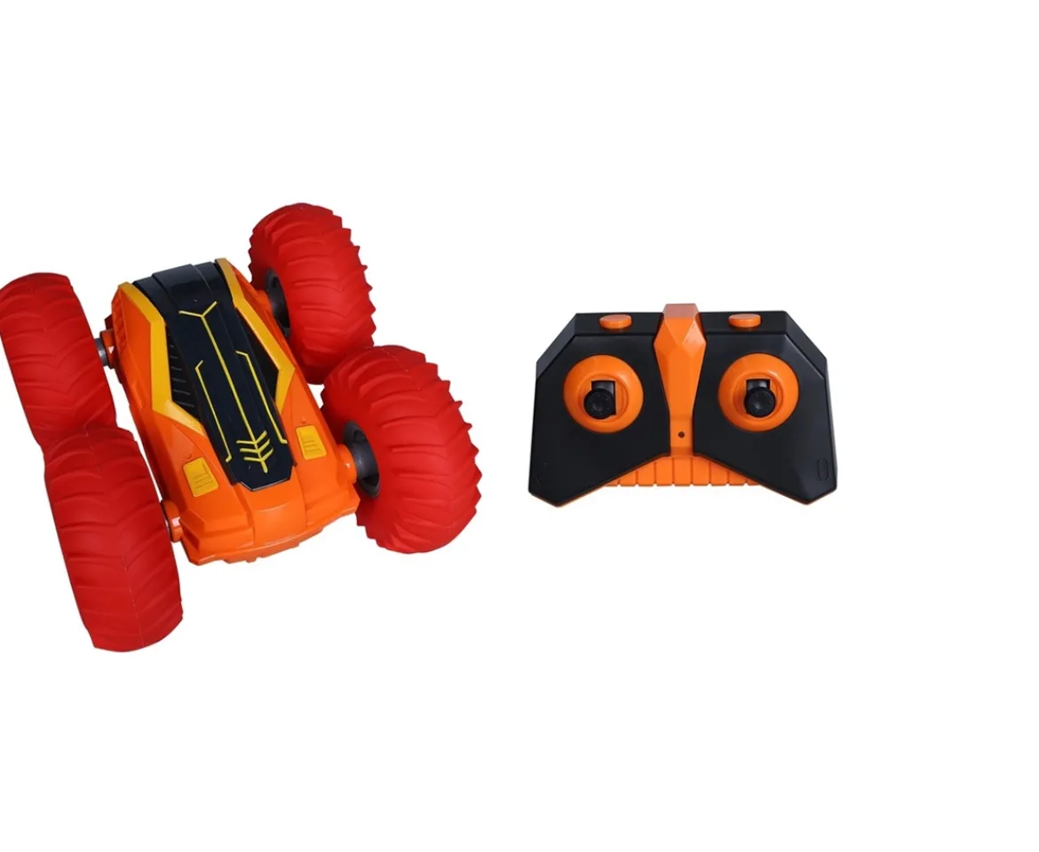 Perform awesome stunts with the Speed Cyclone Radio Control Car in Orange and Red! Featuring oversized wheels for 360° spins, jumps and flips, this epic stunt car moves like a cyclone — nothing gets in its way!Race, drift, flip and spin in all directions with full-function directional control. With massive inflatable tyres, this sleek RC stunt car is made for extreme action, with 360° rotation and double- side running. Hit the brakes to flip over obstacles, or bump walls for dramatic backflips!