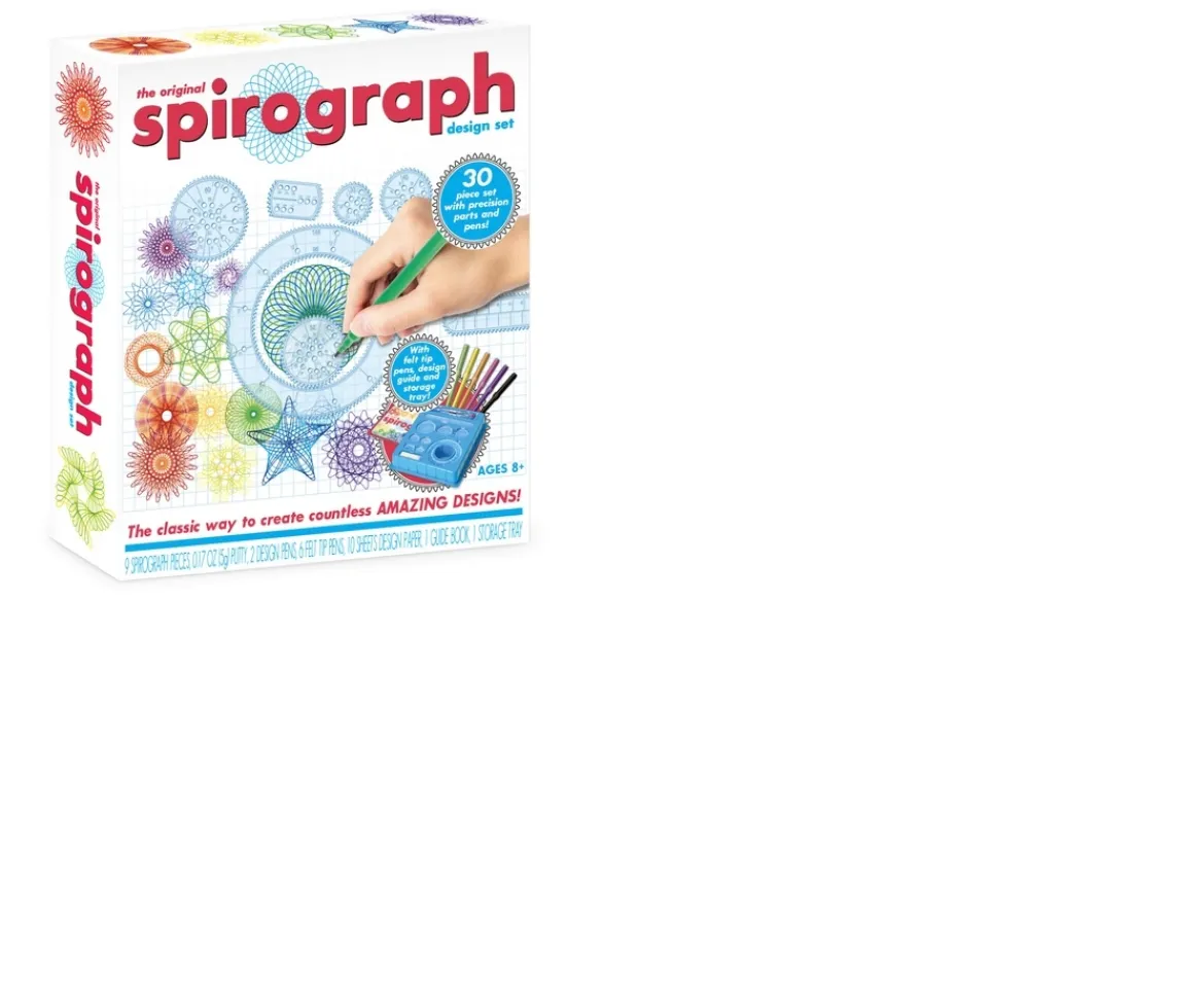 The Spirograph Design Set is the perfect way to create limitless amazing designs! The 30-piece set contains precision parts, pens, and new reusable Spiro-Putty! Spiro-Putty holds the fixed position Spirograph pieces firmly in place on the paper for precision detailing!The set also includes a snap-in storage tray, 10 sheets of design paper and a full-colour design guide, which explains the essentials of drawing with Spirograph as well as step-by-step instructions for creating your own designs.