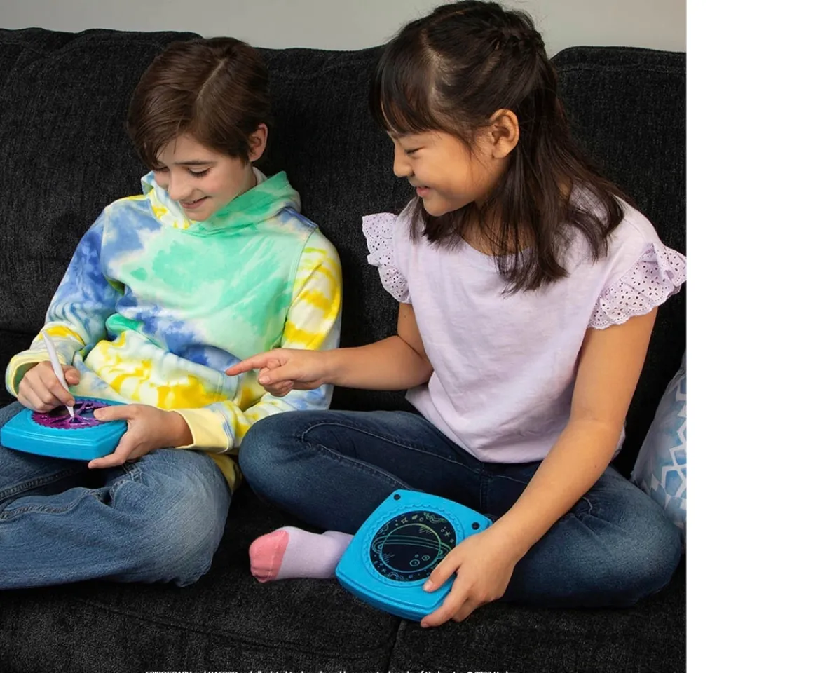 Create endless Spirograph designs on the LCD screen using stencil wheels! Draw easily on the go or at home, then save and display your colourful artwork. Reset your screen with the push of a button to keep on creating new designs! No paper, no pens, no mess! Let’s get doodling!