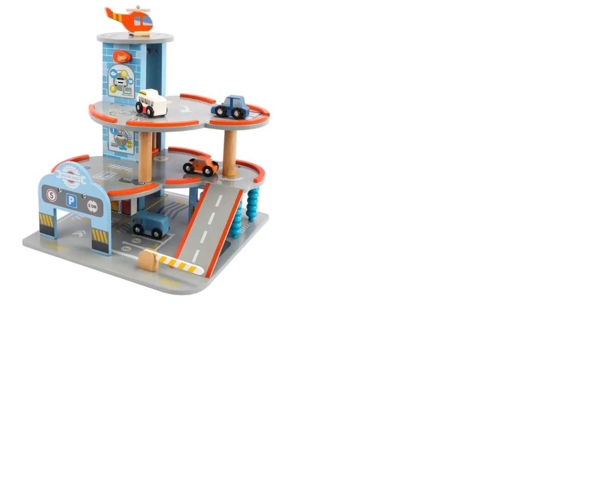With this beautiful wooden parking garage with helicopter deck, the hours fly by while playing. The parking garage has a helicopter deck with a real wooden helicopter. You can also park the cars in the parking lots and go along the car wash with the cars. The parking garage comes in a set with 4 wooden cars and a wooden helicopter included.