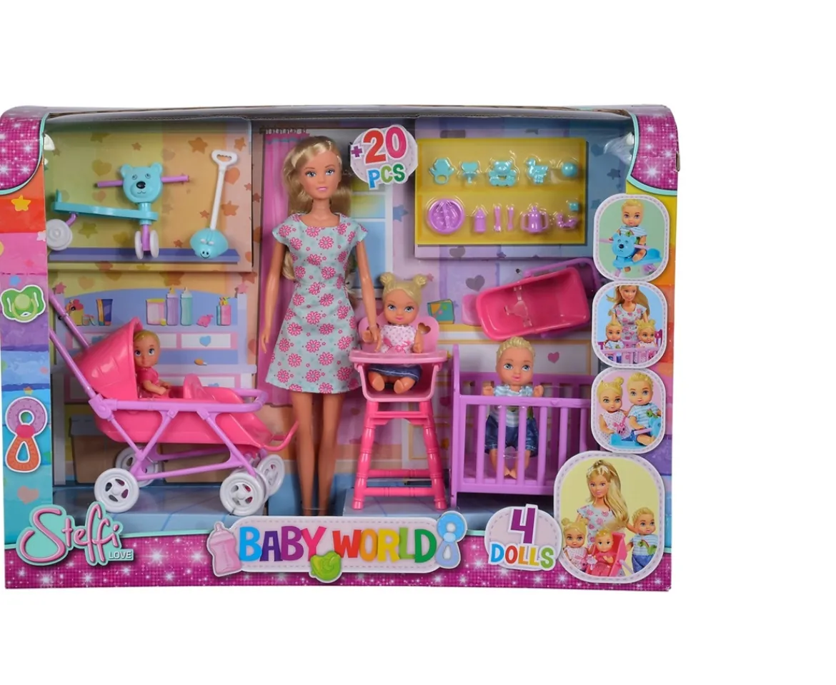 This set including Steffi Love dolls, baby room furnishings and accessories makes playful childcare really fun!Discover pretty furniture like a baby cot and a baby bouncer, great accessories for on the go like a pram, a tricycle, a shovel and lots of toys. There is room for all three children in the dolls’ furniture and Steffi Love can take care of the little ones in peace.The toy set includes the dolls Steffi Love, Evi and Timmy Love and a baby.