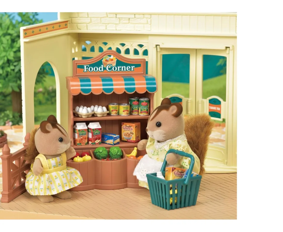 Grocery Market is the go-to destination for Sylvanians looking for fresh produce and ingredients to cook a yummy dinner with! With total of 40 pieces, this set includes juices, eggs, milk, cereals, crackers, fruits and veg, and canned goods. A shopping basket is also included. Place the food onto the counter, slide the bar, and pop the goods into your shopping basket!Grocery Market features a brick wall, a green roof, a checkout counter and shelving. Figures can come in and out of the side entrance. The walls and flooring of the shop can be detached. You can change the floor area both inside and outside the shop, providing plenty of fun in the new space. Red Roof Cosy Cottage has the same floor size, and can be lined up alongside perfectly (sold separately).