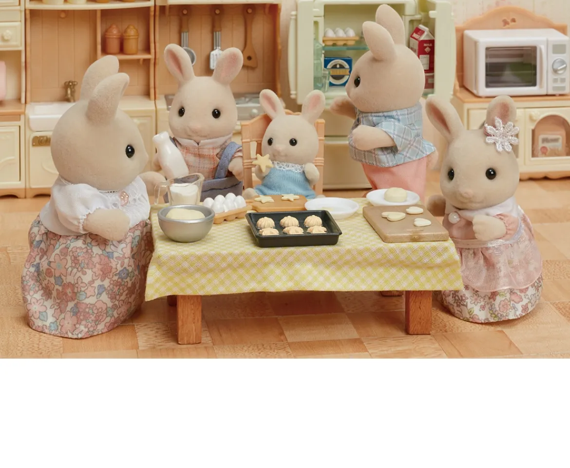 Set featuring the Milk Rabbit family in lively pink and blue outfits. Includes Milk Rabbit father, mother, boy and girl.