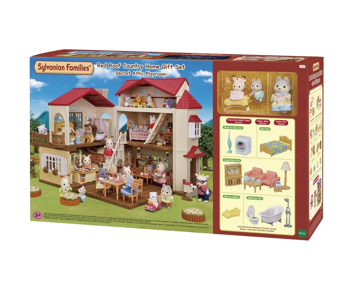 - Contents: 1x Red Roof Country Home, 1x Chocolate Rabbit baby figure, 2x Husky figures, 1x single bed, 1x quilt, 1x wardrobe, 1x lamp, 1x toilet, 1x shower, 1x bath tub, 1x towel, 1x vacuum, 1x washer, 1x table, 2x chairs, 2x photos, 1x rack & 1x tea set