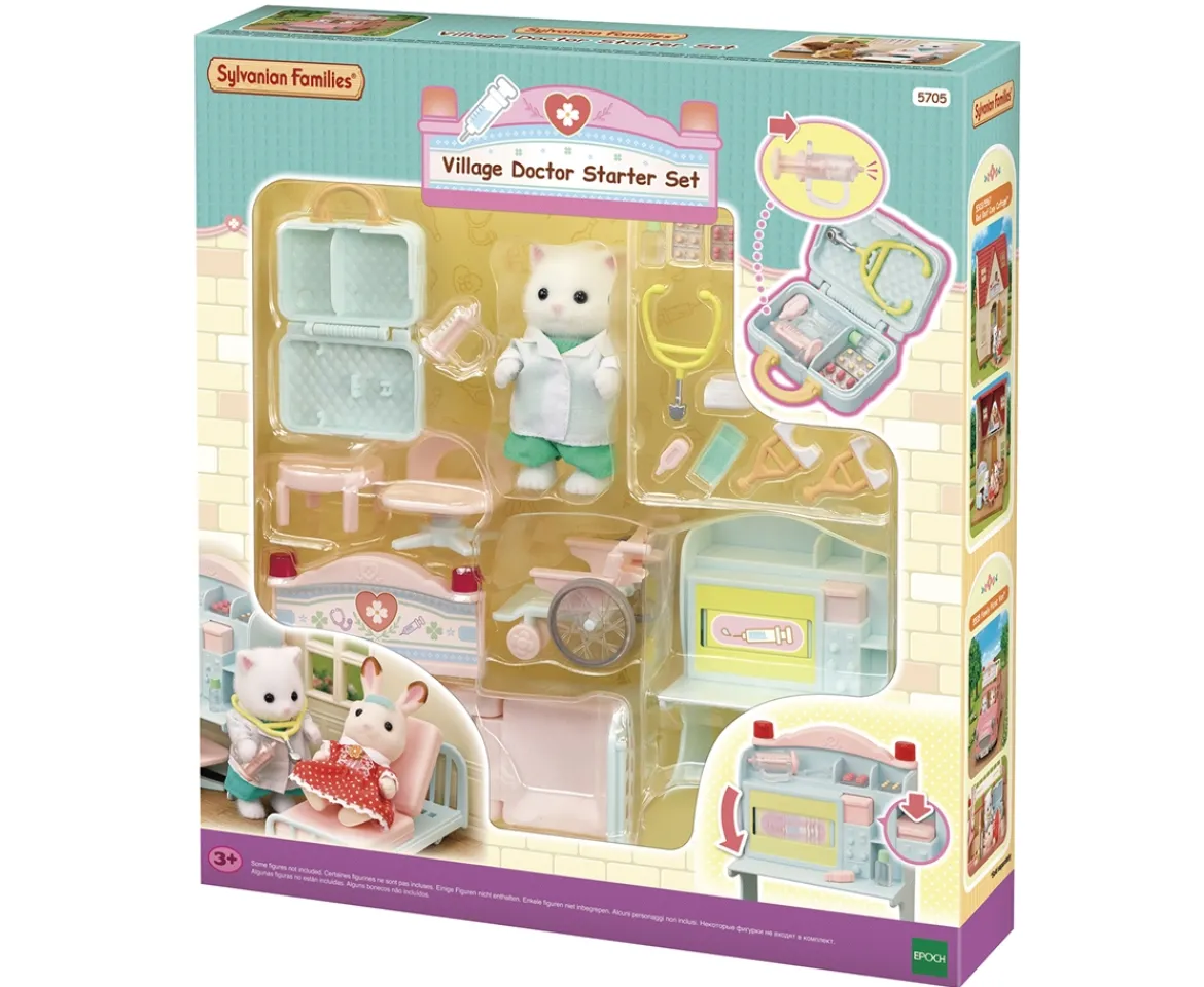 The Village Doctor Starter Set featuring everything you need to pretend playing doctor, including figure with white coat, check-up machine and other medical tools. Help keep healthy with the included syringes, stethoscope, bed, wheelchair, medicine and other accessories. The doctor’s bag can be used to store the syringes, stethoscope and medicine. The plaster cast can git onto child figures. Includes Persian Cat mother, Doctor Dawn.Combine with the Red Roof Cosy Cottage (sold separately) to turn the house into a doctor’s surgery! Combine with vehicle sets like the Family Picnic Van or Family Campervan (sold separately) to turn the cars into an ambulance!