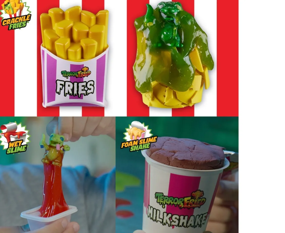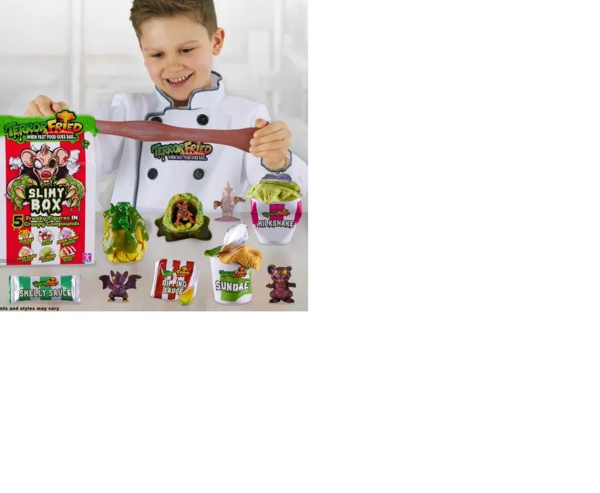 Discover the nastiest, freakiest figures from deep inside the fast-food fryer. Each Terror Fried meal includes creepy compounds, allowing you to fizz, squish, crack, and ooze as you play through multiple layers of discovery and gross out reveals – it’s Terror Frying! The 6-piece Terror Fried Slimy Box includes all your fast-food favourites with a terrifying twist.The nugget and burger ‘fry’ in water to reveal a freaky figure. Crack open the fries and squish the cup of flurry for more horrible surprises – the Slimy Box has 6 compounds with 5 creepy collectible figures inside! Find and collect over 30 Terror Fried figures (each sold separately), including rare neon and super-rare metallic figures! Includes collector’s sheet to track your Terror Fried creature collection.