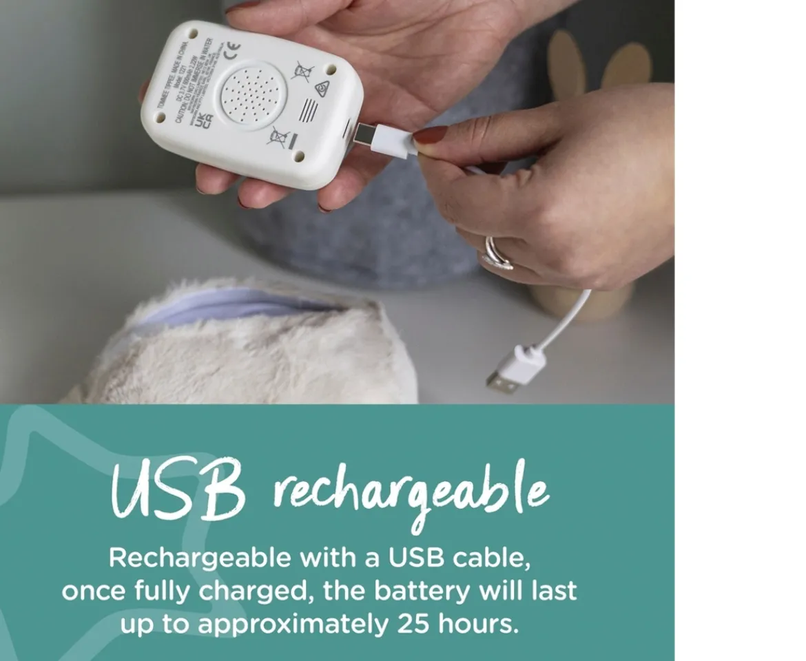 Helping your baby learn how to fall asleep and resettle after waking is the foundation of a lifetime of restful sleep. With a soft-glow nightlight, intelligent CrySensor and soothing sounds and lullabies, this cute and cuddly night-time companion will help you and your baby to get a good night’s sleep.Ollie’s plush fur is super soft for little fingers to touch and explore, and as he’s machine-washable, he will always be in a clean cuddle condition. His sleepy moon shaped eyes and soft, squishy tummy with star, heart and moon design make him a best friend that baby will forever love to the moon and stars.Ollie has a sound for every baby with 3 natural sounds including white noise, rainfall, and a heartbeat, 3 classic lullabies with adjustable volume and 3 light levels to choose from. The intelligent CrySensor listens out for your little one after they fall asleep and responds to baby’s cries by automatically switching on his comforting sound and light for 20 minutes, to help resettle them and soothe them back to sleep.Ollie is rechargeable with a USB cable and once fully charged, the long-lasting battery will last for up to 25 hours. The electronic module can be easily removed meaning Ollie is conveniently machine- washable at 30°, allowing you to freshen him up whenever needed.