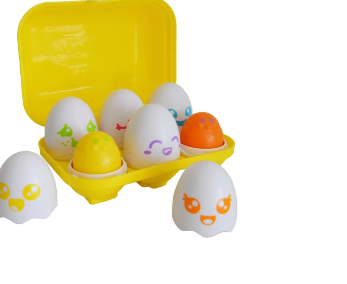 - Sort the eggs into their unique slot in the egg carton, featuring round pegs, square holes, triangles, stars