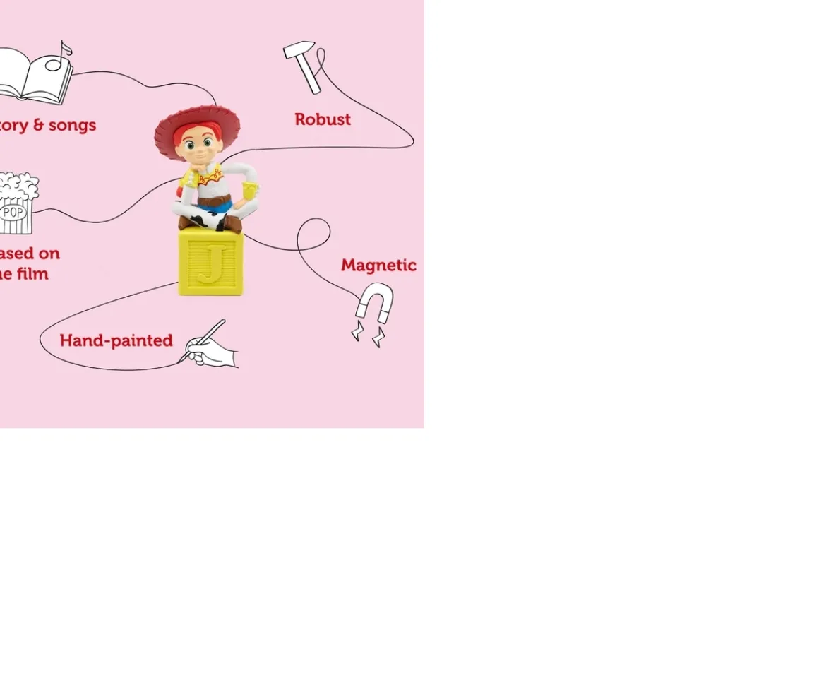 Tonies are beautiful hand-painted figures that play audiobooks, songs and stories when placed on a Toniebox. Take music and bedtime stories wherever you go with fun characters, simple controls, and no bright screens.Easy to UsePlace a Tonie on top of your Toniebox to play stories or songs. Take it off to stop. Its easy, even for 4-year-olds!Made for KidsFun characters and kid-friendly designs make Tonies the perfect companion for bedtime stories and lullabies, imaginative play and long or short car journeys.Loved by ParentsWelcome to screen-free play. Tonies replace bright, over-stimulating screens with hand-painted figures and simple tactile controls.Featuring abridged versions of both the Toy Story 3 and 4 film, this Toy Story Jessie Audio Tonie is the perfect playtime soundtrack. Follow along as the toys are accidentally donated to a Day Care centre and then head off on a road trip. All little play rangers need to do is pop Jessie on top of a Toniebox (sold separately), and join the gang for some fun!