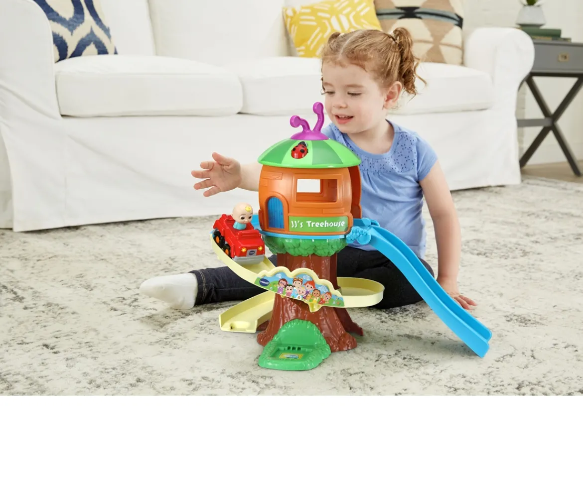 Your child’s imagination will fly with this play set that looks like JJ’s treehouse. Hop in JJ’s off roader and zoom around! Ride around the track set and launch down the ramp! Little ones can develop motor skills while triggering cause and effect activities. SmartPoints™ trigger songs, sounds and phrases that reinforce words. Give JJ a pat on the head to hear his voice and songs from the show, exploring working together and sharing.
