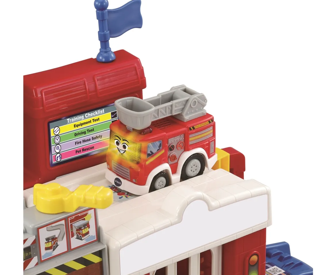 Ring the bell and launch the SmartPoint™ fire engine down the ramp and off to the fire. Spiral track links up with the lift or change the route of the tracks using the chunky lever! Play set includes four SmartPoint™ locations that trigger fun phrases and sounds when driven over with the included Toot-Toot Fire Engine. Manipulative features include twisting flag, swing-up fire station door, flip down fire and fuel pump. Also includes fire & fire extinguisher accessories.