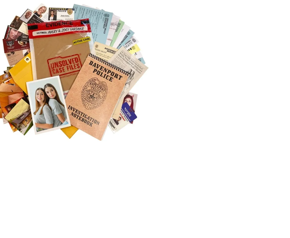 Become a cold case detective and solve the mysteries to crack the case! Unsolved Case Files puts you in the shoes of a cold case detective tasked with solving the Avery & Zoey Gardner Case.At 4:23 am, an unknown assailant broke into the remote lake house where 19-year-old twins Avery and Zoey Gardner were sleeping. The attacker murdered Avery and disappeared with Zoey before police could arrive. Despite investigators’ best efforts to locate the killer, he remains at large. New reports show that after Homicide Detective, Angie Cullen, made a breakthrough in the case, she mysteriously disappeared as well, leaving only her notebook behind. Now two lives are on the line, and it’s up to you to bring the killer to justice before it’s too late. Review the details of Detective Cullen’s notebook to find out where Zoey was taken and why. Search through hundreds of pieces of evidence including newspaper clippings, police documentation, crime scene photos, and more, then use online answer keys to solve the case.Think you’ve got it? Visit the dedicated Unsolved Case Files website and if you don’t have the answer right you can keep investigating without being spoiled by the right answers. A perfect game for individuals, couples and parties.