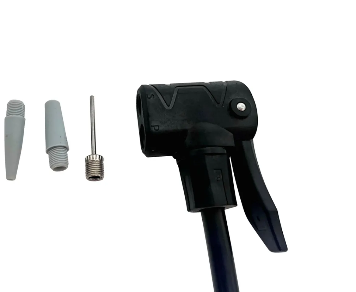 The Verve Floor Pump is a sleek and user-friendly air pump. With a large handle for easy grip and a stable base, it ensures hassle-free inflation.This versatile pump includes four nozzles, making it suitable for use with bicycles, cars, motorbikes, hovercraft and various balls. The large nozzle is compatible with Schrader, Presta and Dunlop valves. Easily monitor the large gauge to pump effortlessly and achieve high air pressure.