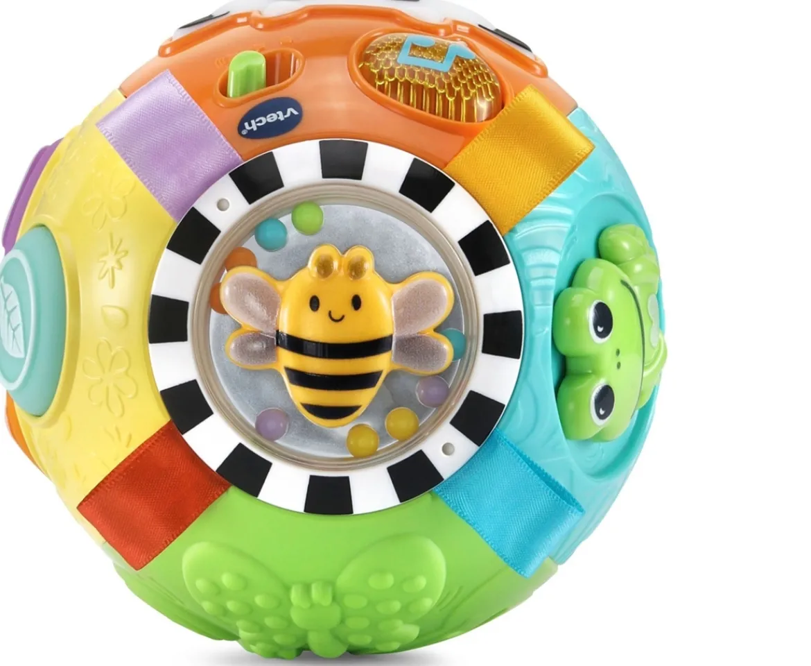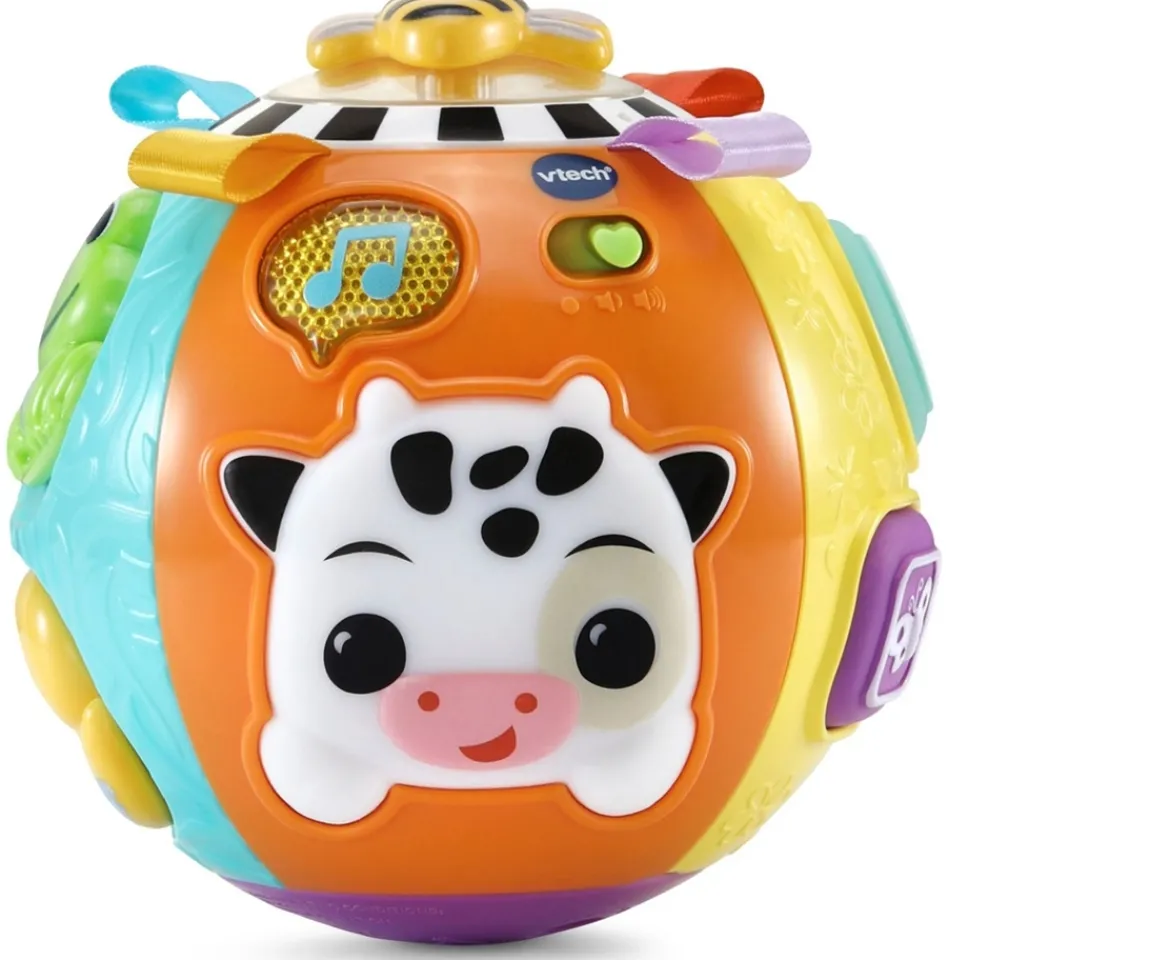 Let your baby explore a world of fun and learning with the VTech Animal Discoveries Ball! This interactive toy offers five sides of engaging play, combining electronic and hands-on activities. The cheerful cow button introduces fun phrases, while the music button lights up and plays delightful sounds. Press the soft shape buttons to learn shapes and colors, perfect for early learning.Encourage motor skills with twistable, slidable, and spinnable features, such as the Duck, Frog, and Bee elements. Shake the ball to activate beads and stimulate auditory development, while textured patterns like leaves and trees provide exciting tactile exploration. Four colourful fabric tags enhance sensory play, and a motion sensor rewards your baby’s movements with cheerful sound effects.Designed for little ones aged 3 to 24 months, this vibrant ball is perfect for fostering motor skills, sensory discovery, and early learning through play.
