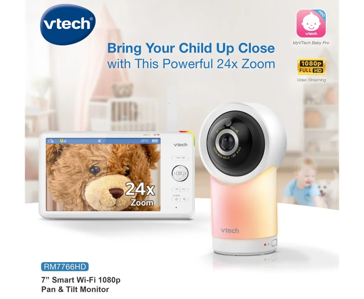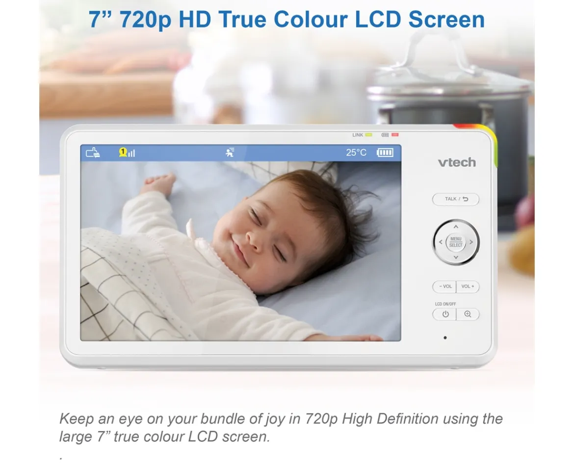 This 7″ HD colour monitor allows you clearly see your little one on the parent unit. You can achieve 360 degrees up & down from the parent unit or remote & 10 remote digital x zoom. Free live remote access via a smartphone, with up to 15 hours of video & 22 hours of audio battery life. A soothing multi colour light on the baby unit gently illuminates a dark nursery with a choice of colours. Five soothing sounds and lullabies will help settle baby to sleep. With two way talk back intercom to sooth baby with your own voice. The humidity & temperature