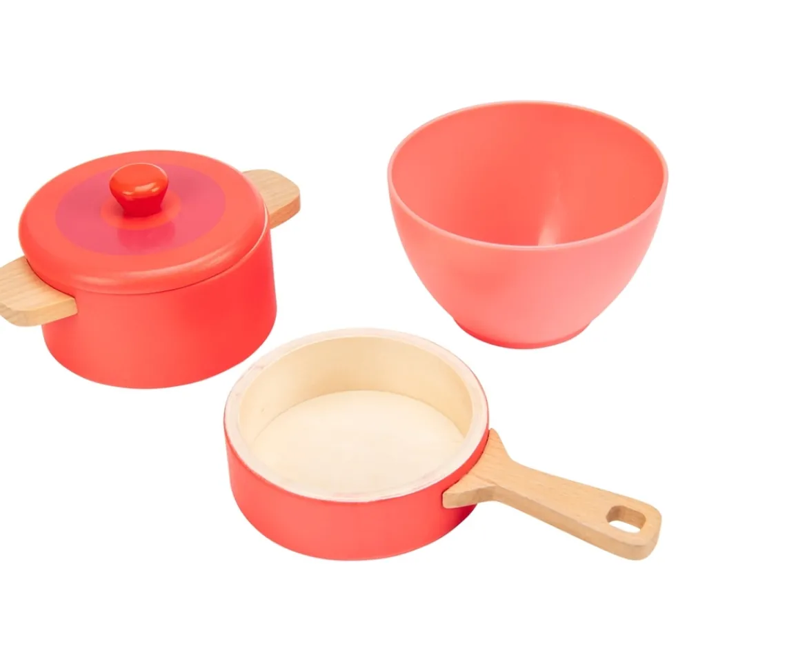 - Contents: 1x pot, 1x saucepan, 1x bowl, 1x tray, 1x olive oil bottle, 4x utensils, x1 salt, x1 pepper