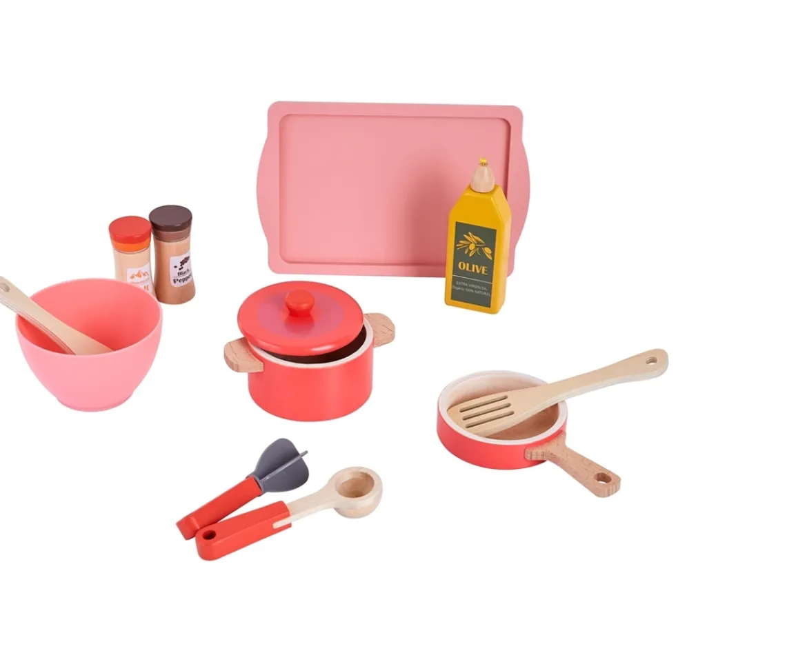 Let your little ones’ imagination soar with this Wooden Cookware Playset! This charming and practical set includes everything your child needs to whip up imaginary culinary creations, from pots and pans to utensils and seasonings. Each piece is crafted from wood and designed for hours of imaginative play, perfectly sized for small hands.The set features a salt shaker and pepper mill that mimic real-life functionality: they have beads inside that shake to simulate the sound of real salt and pepper, and the top clicks just like authentic grinders! The olive oil bottle includes a mini cord that extends when shaken, creating a realistic pouring effect that retracts when the bottle is tilted. With its vibrant colors and simplistic design, this playset is sure to inspire endless cooking adventures!