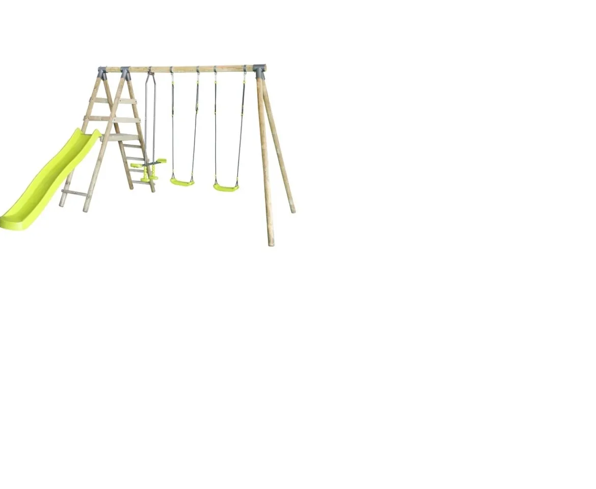 The Wooden Play Centre has 2 swings, a glider and a giant wavy slide, so there’s lots of room to play with friends. This beautiful wooden swing and slide set is excellent play value. Adjustable SwingsThe Wooden Play Centre has 2 adjustable swings for outdoor fun. It’s easy to change the seat height or attach the swings with the powder coated galvanised steel wraparound collars. Steel GliderA glider has room for two, with plastic moulded seats and footrests so children child can play in comfort and safety. The galvanised steel frame is made for strength and durability. Wavy SlideClimb the steps to a wooden platform with lots of room to play, then slide on down a giant wavy slide. Wooden FrameThe Wooden Play Centre has an FSC-certified wooden frame with a natural finish. The wood is pressure treated, so there’s no need to apply stain. Any natural cracks and splits in the heartwood will not have an impact on the play centre’s strong frame. Physical DevelopmentMovement based play helps to engage all our senses and build healthy hearts. Physical sensory toys can support the development of motor skills, balance and coordination.