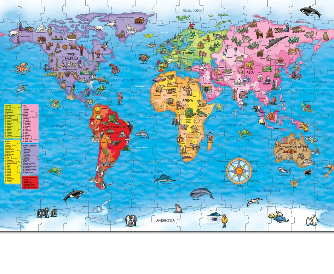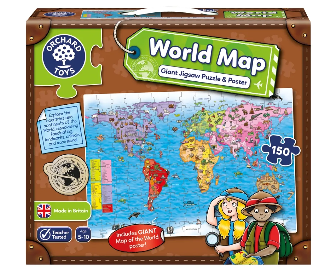 Budding explorers can discover and learn about the countries and continents of the world with this challenging 150 piece jigsaw! Details range from local inhabitants such as the animals of Antarctica to iconic landmarks like the Statue of Liberty.There are hours of fun to be had with this detailed Geography jigsaw, perfect for children aged 5 and over! The fun learning guide on the back of the box and the colourful key around the puzzle are a great way to further learning.